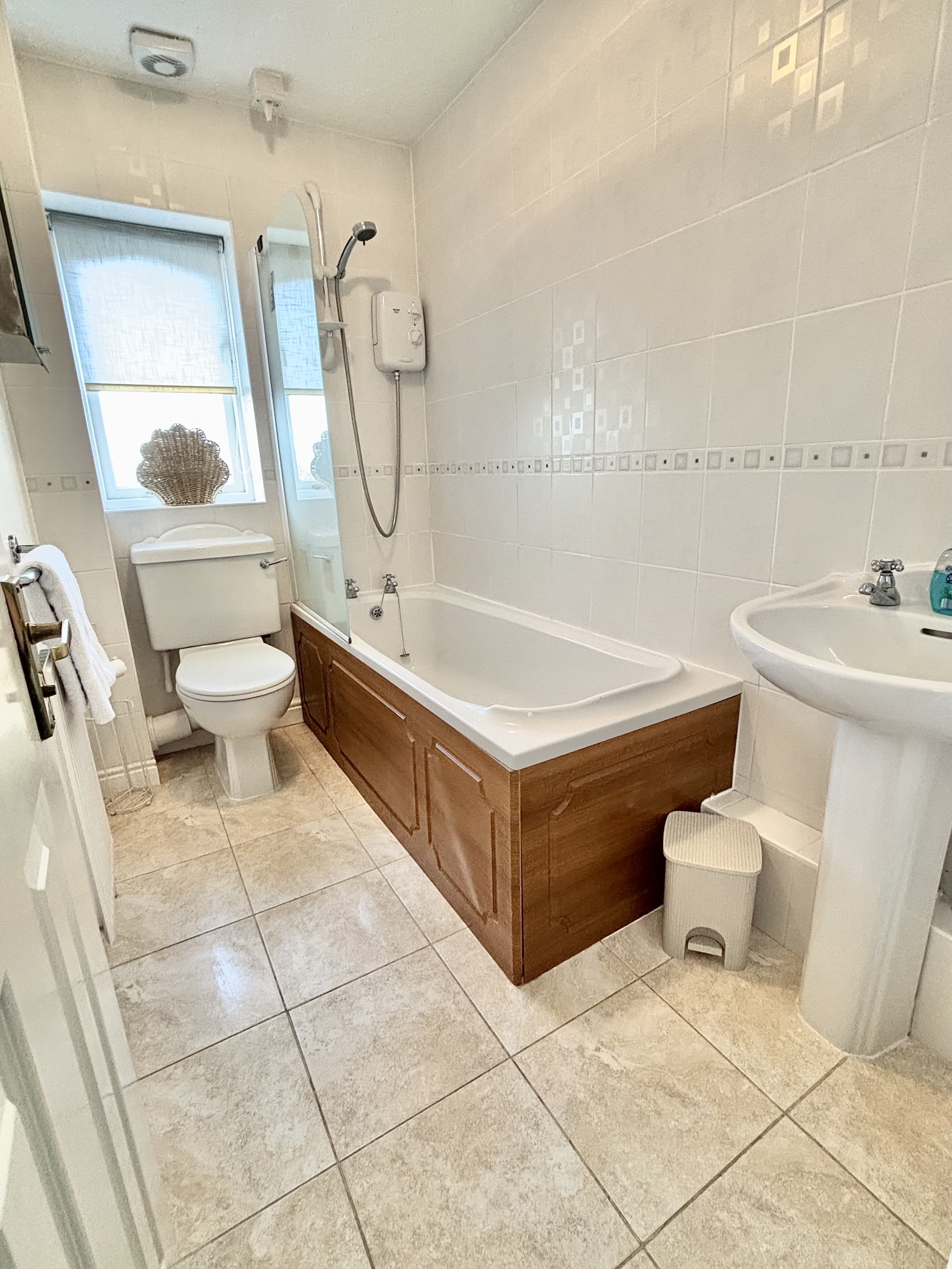 Modern three-piece suite with electric shower over bath, new fixtures and fittings, and a clean, tiled finish.