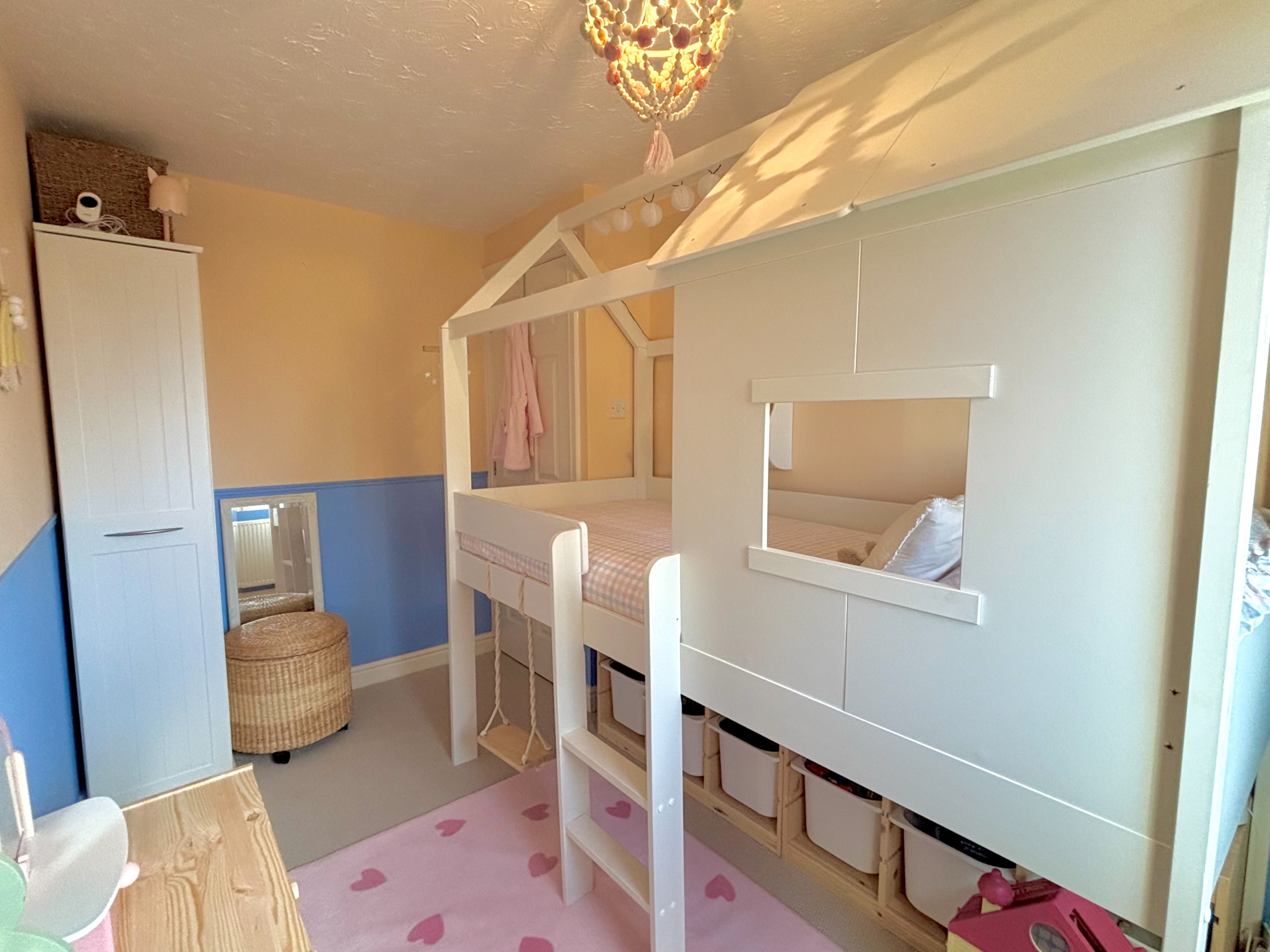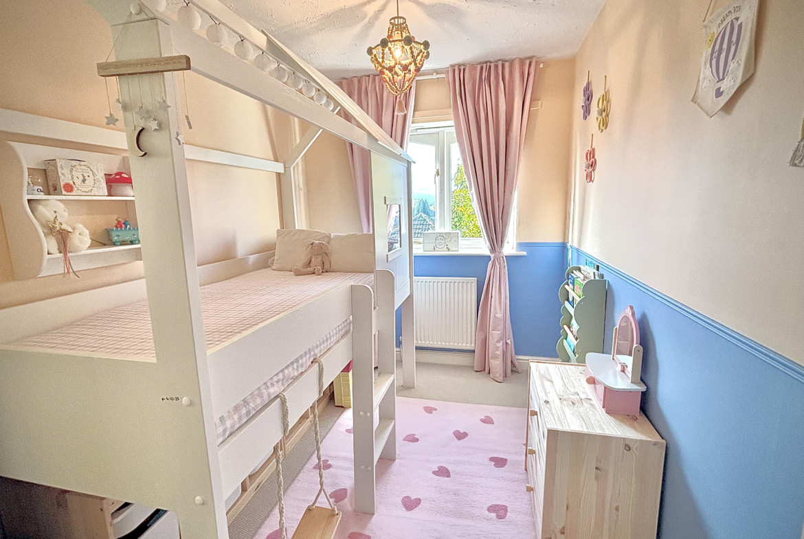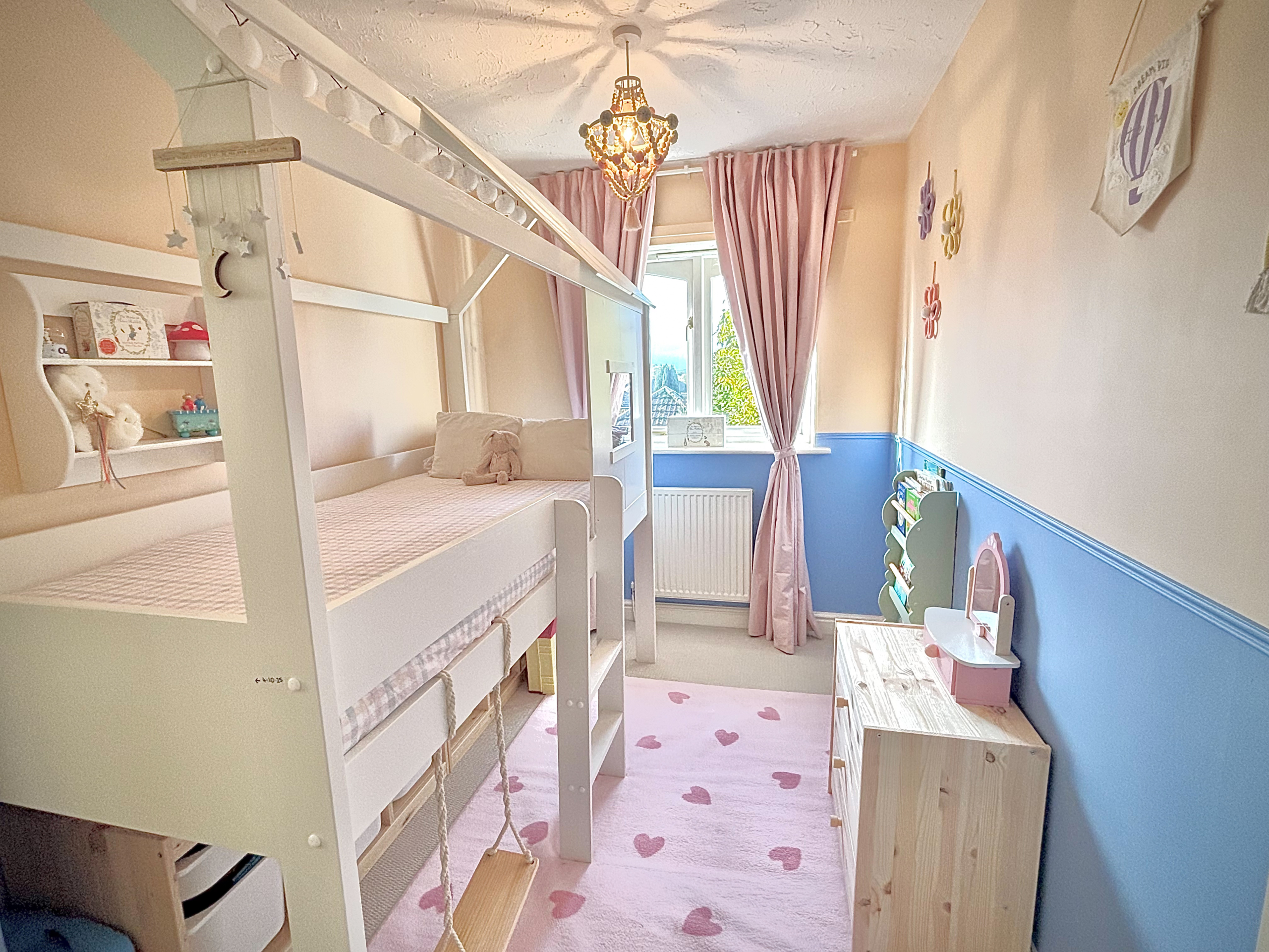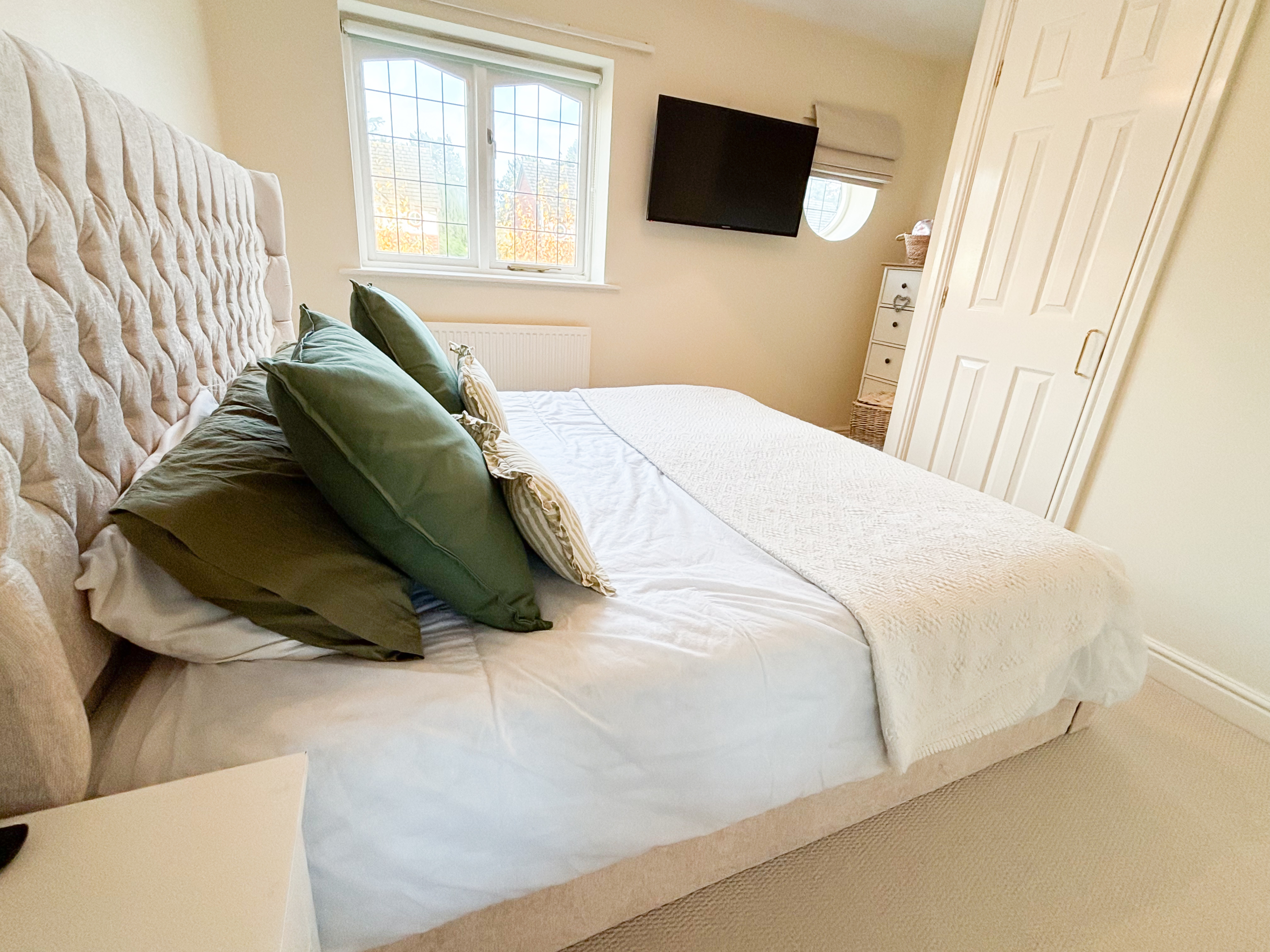 Large main bedroom with new carpet, super-king bed space, and peaceful views of trees and the nearby church tower. Not overlooked.