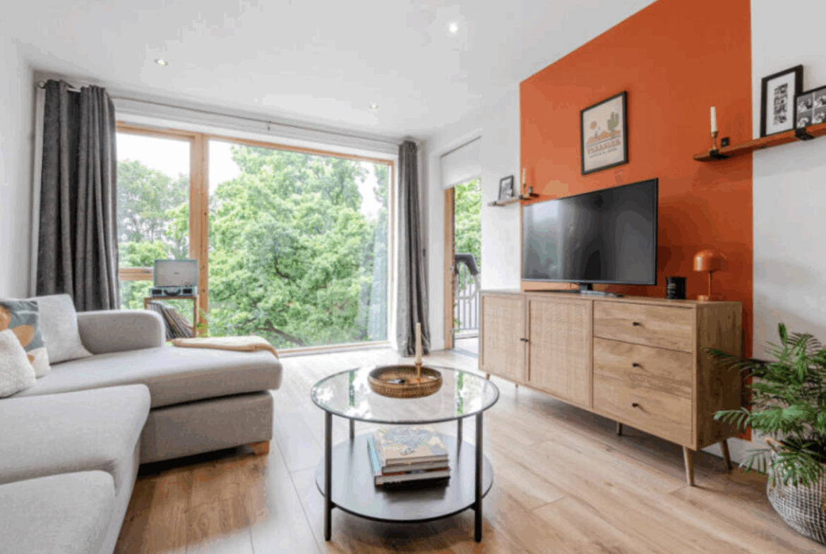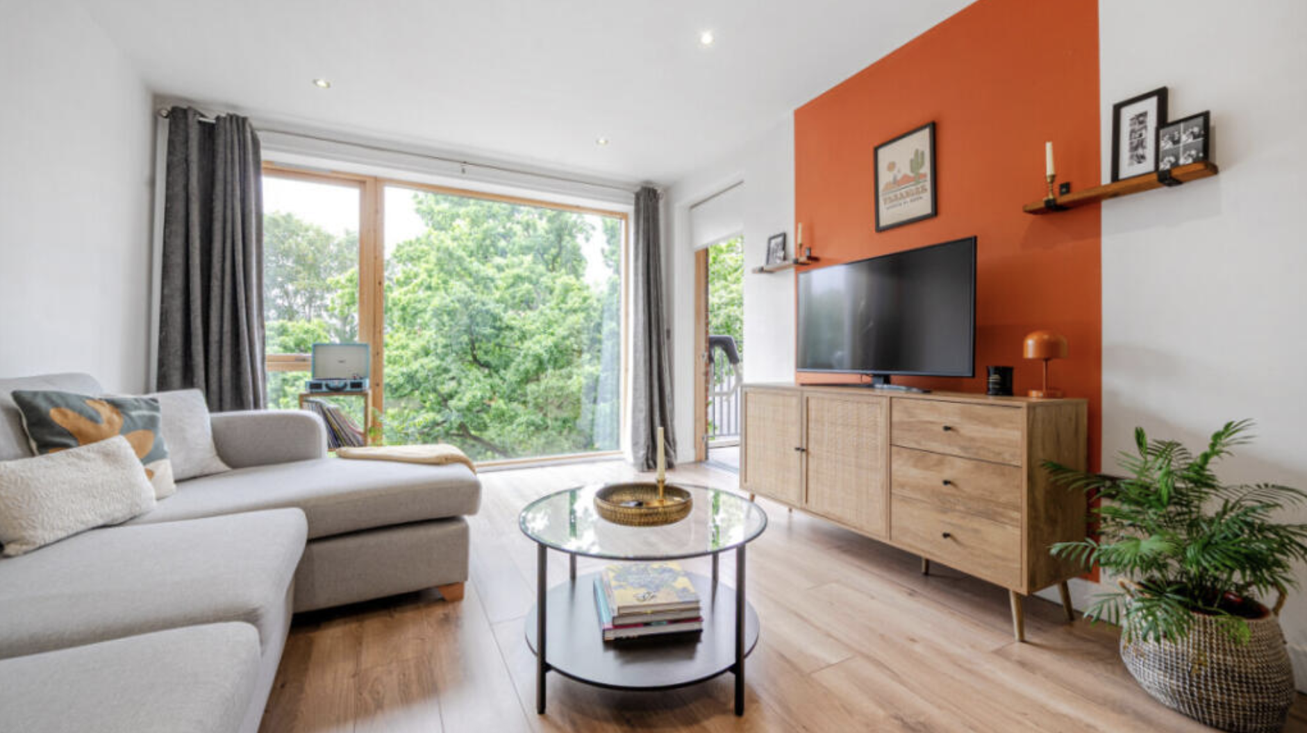 All rooms lead off the central hallway, with storage, in this freshly decorated, generous, west facing apartment. To your right, find a contemporary bathroom and a large double bedroom with triple mirrored wardrobe.  The dual aspect main reception room runs from back to front of the apartment and is lit by floor to ceiling windows with treetop views and overlooking communal gardens. The kitchen is modern and has all built in appliances, from main lounge there is access onto the pretty and spacious balcony.