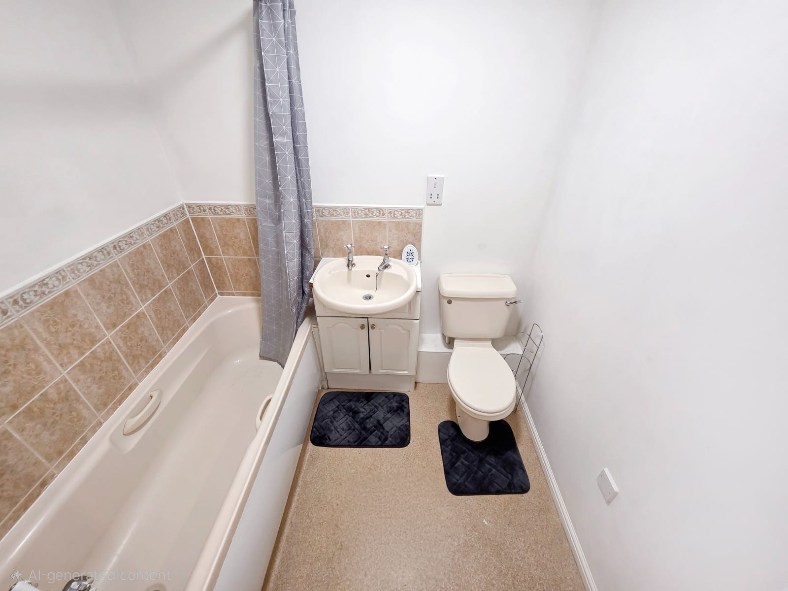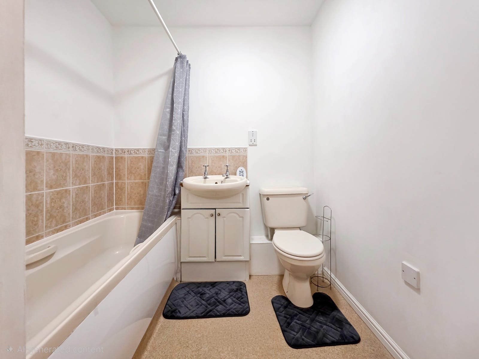 Comprising a panel-enclosed bath with shower attachment, wash hand basin with vanity unit, low-level WC, heated towel rail, and part-tiled walls.