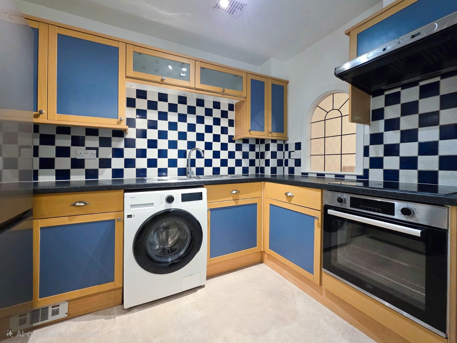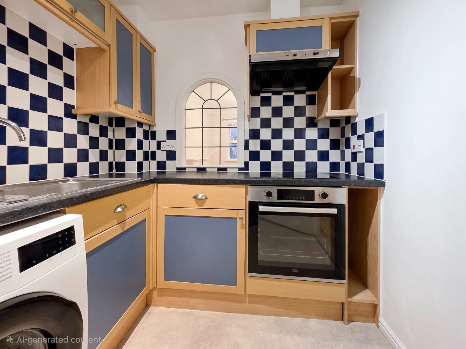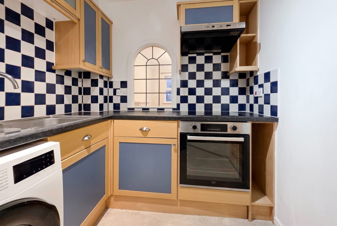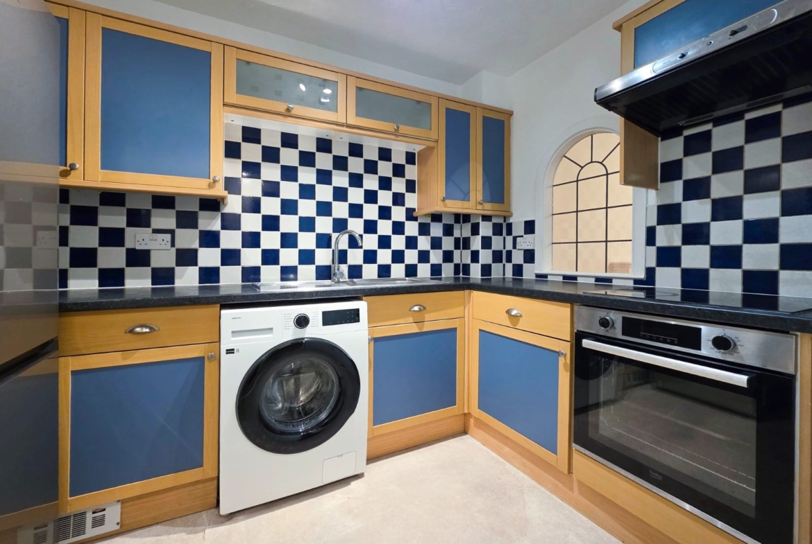 The fitted kitchen features a range of wall and base units with work surfaces, integrated oven with hob and extractor fan, inset sink, and white goods including space for a fridge freezer, washing machine, and dishwasher.