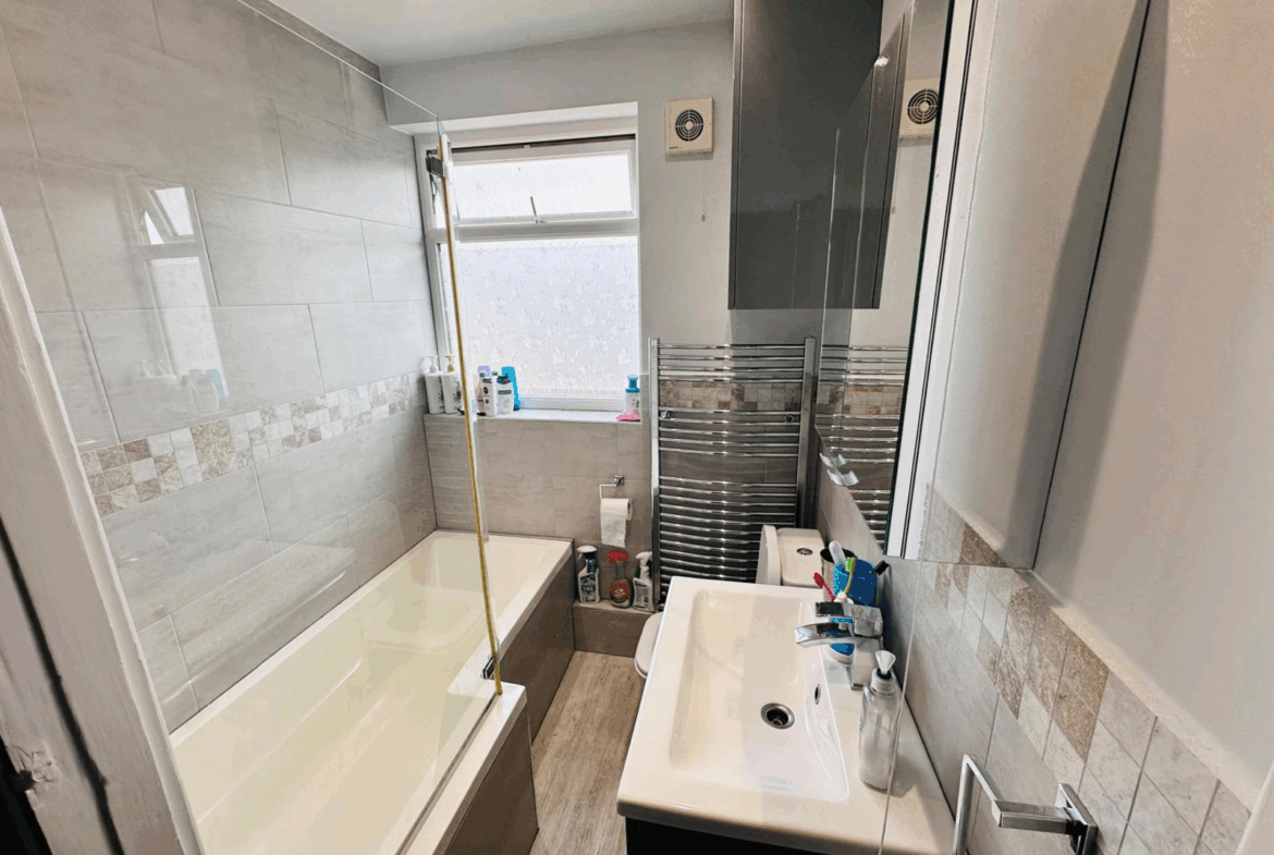 – Ground Floor: The property features one spacious reception room, offering flexibility for a lounge, dining area, or home office . The separate kitchen is fitted with essential appliances like washing machine and gas cooker. The kitchen leads directly to the garden through open door.