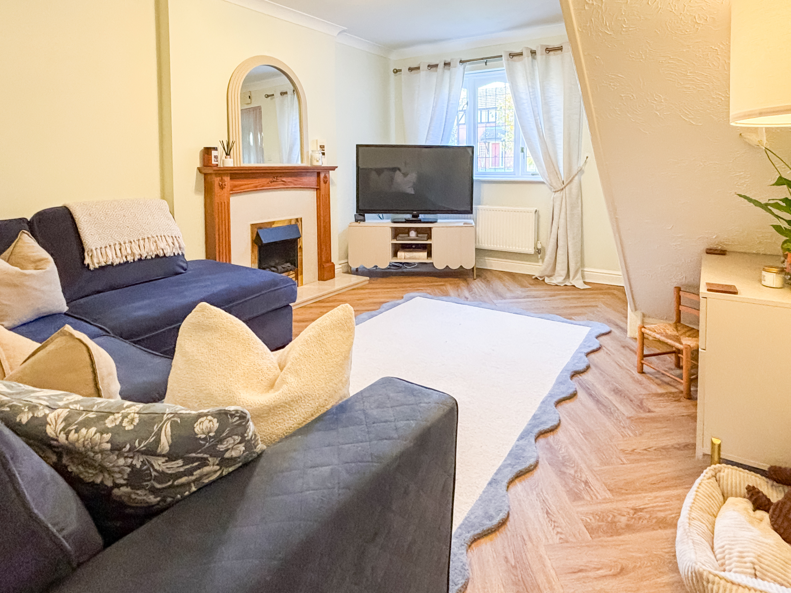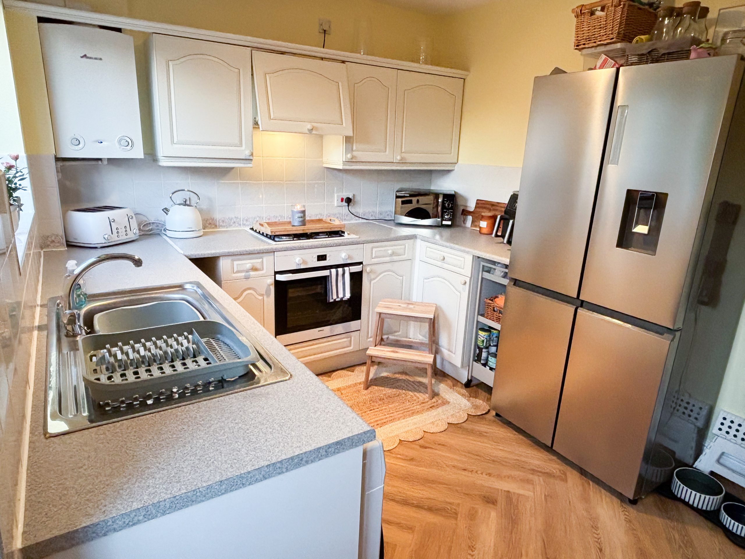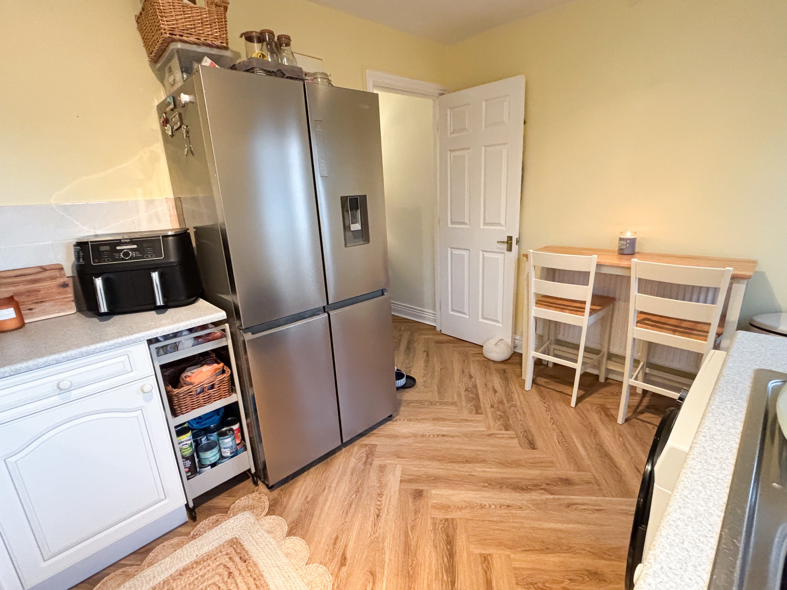 The property comprises a welcoming entrance hallway, a bright living room featuring an electric fireplace with cream marble surround, and a well-laid-out kitchen offering ample storage, worktop space, room for a breakfast bar and space for a double fridge freezer (not included).