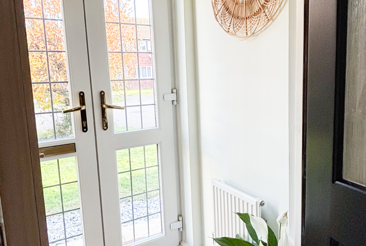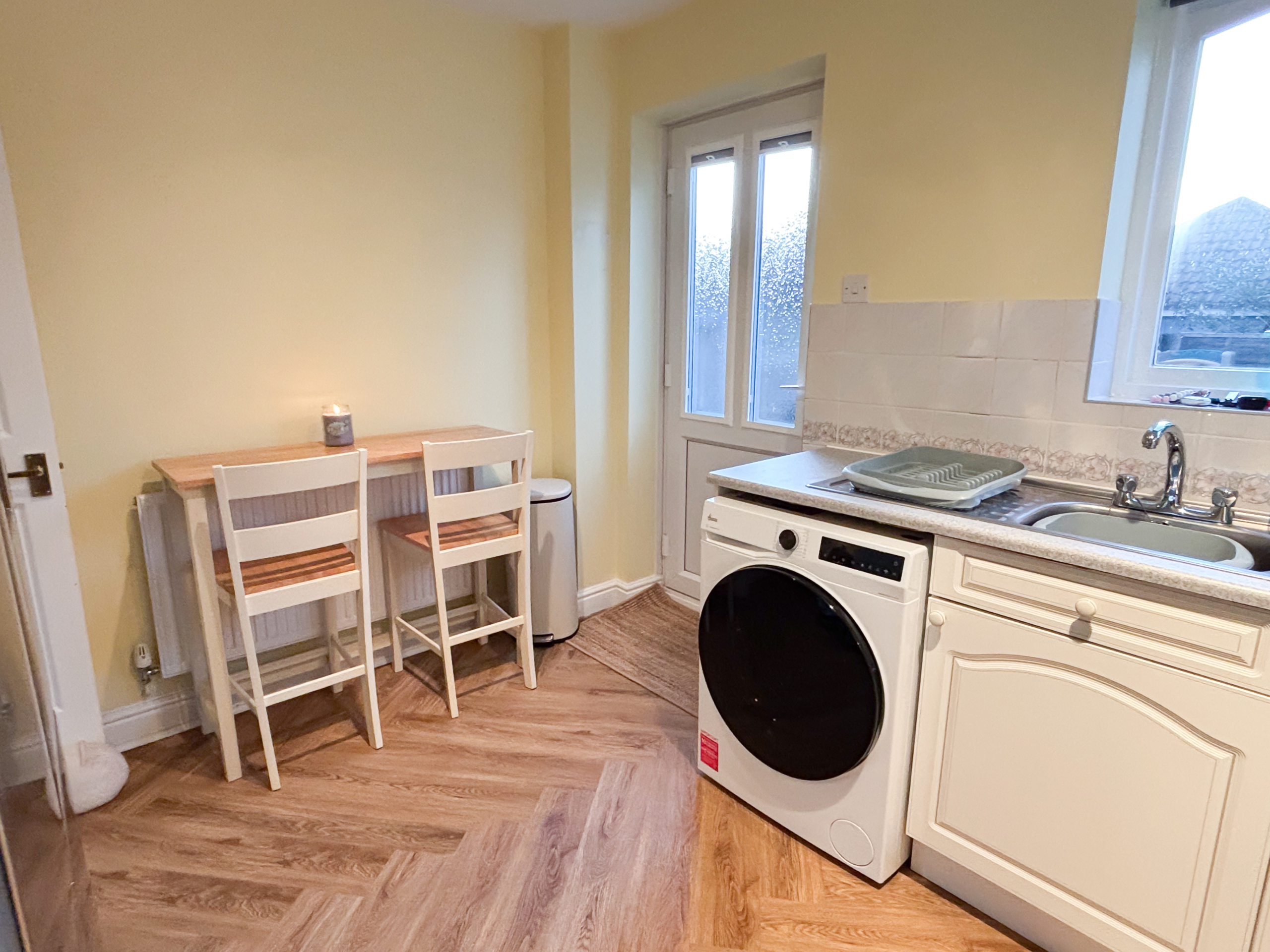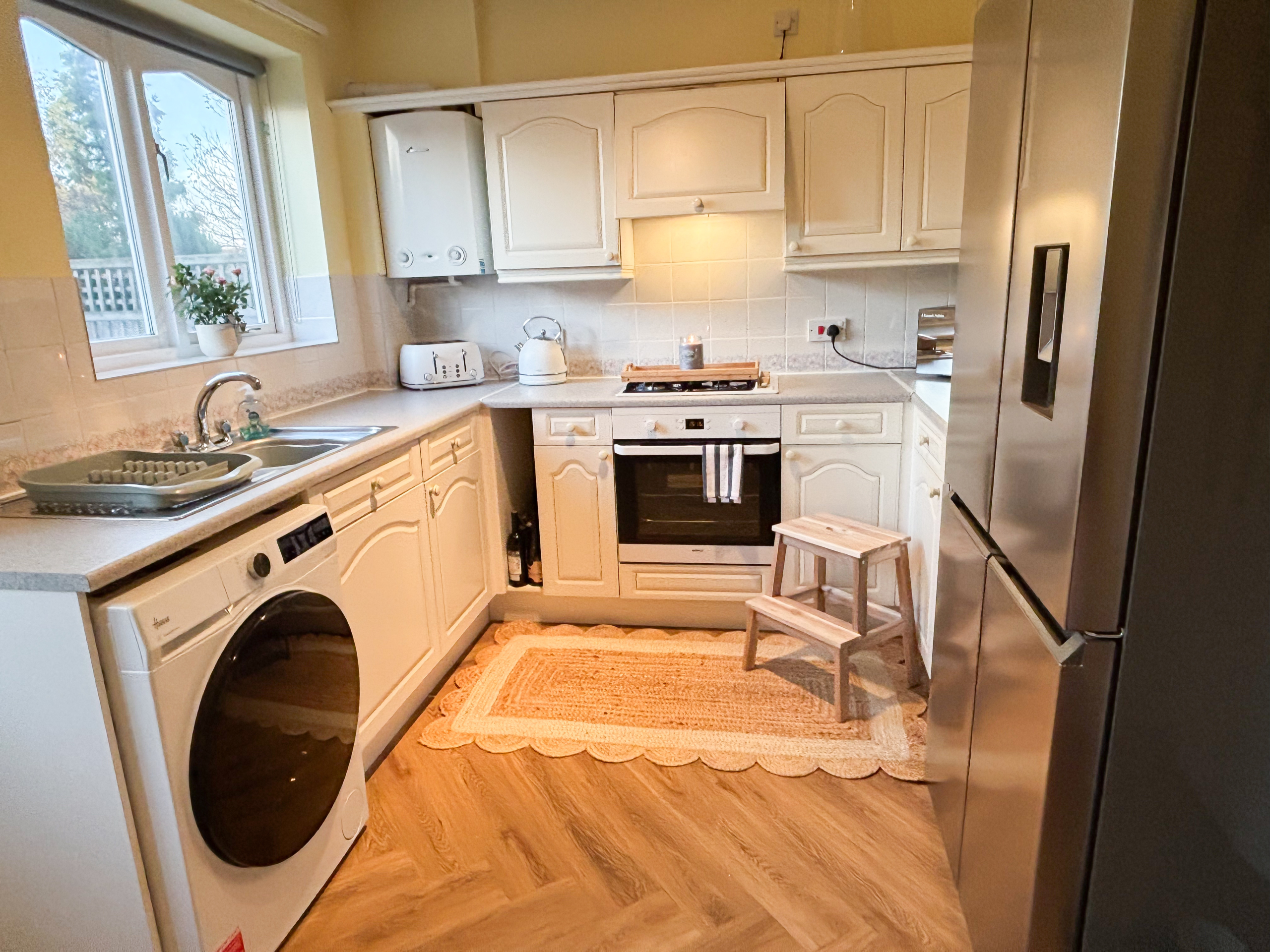 The property comprises a welcoming entrance hallway, a bright living room featuring an electric fireplace with cream marble surround, and a well-laid-out kitchen offering ample storage, worktop space, room for a breakfast bar and space for a double fridge freezer (not included).