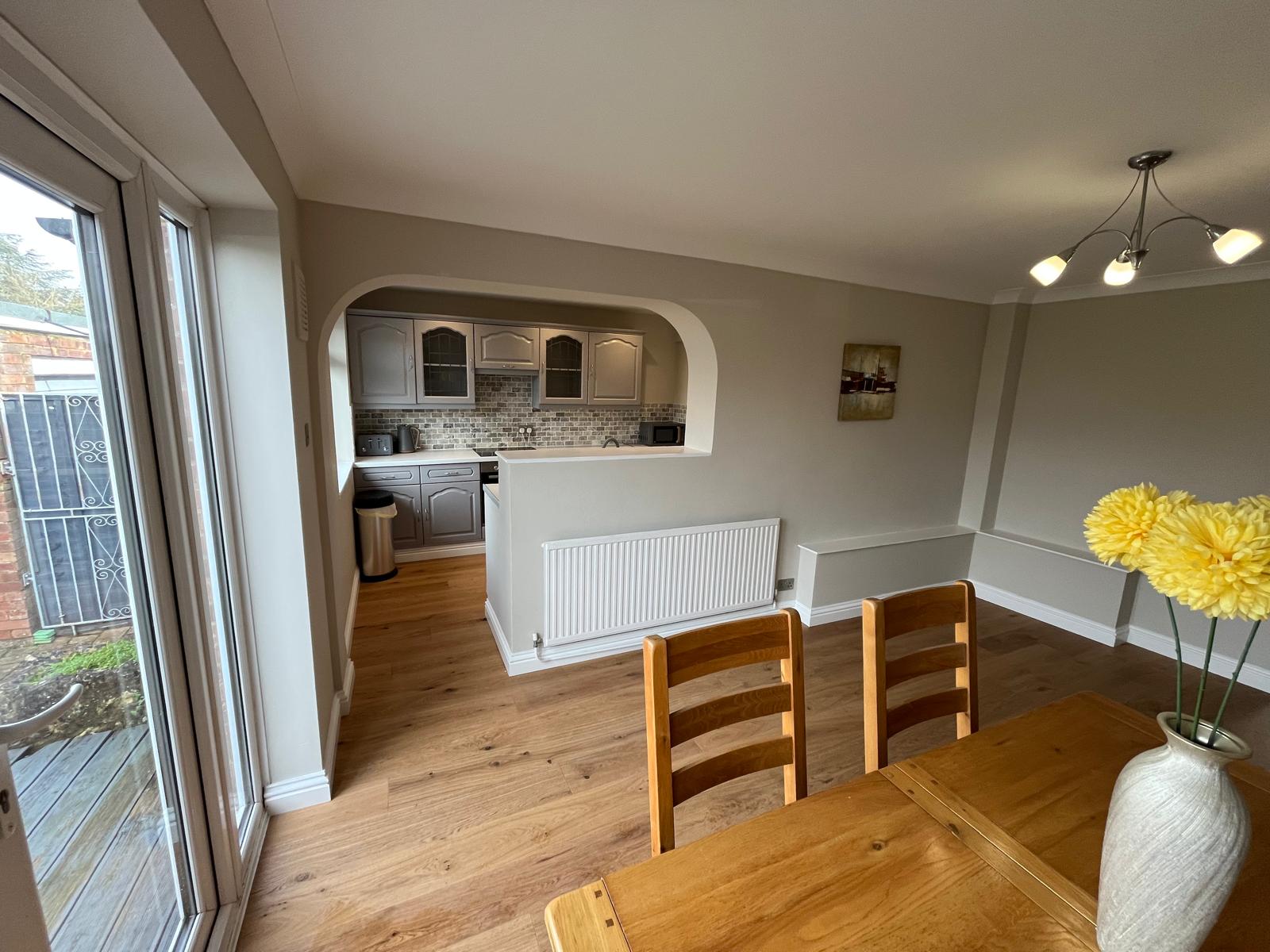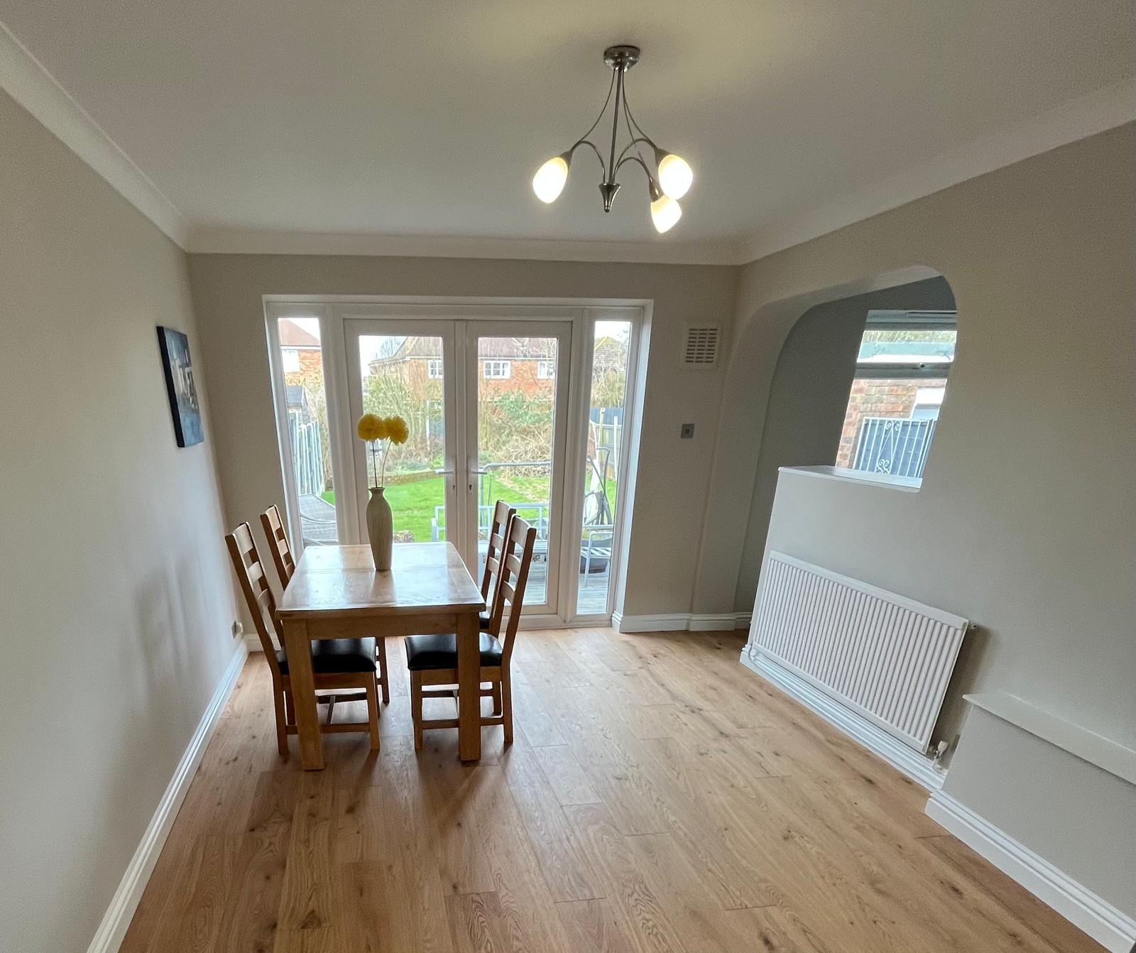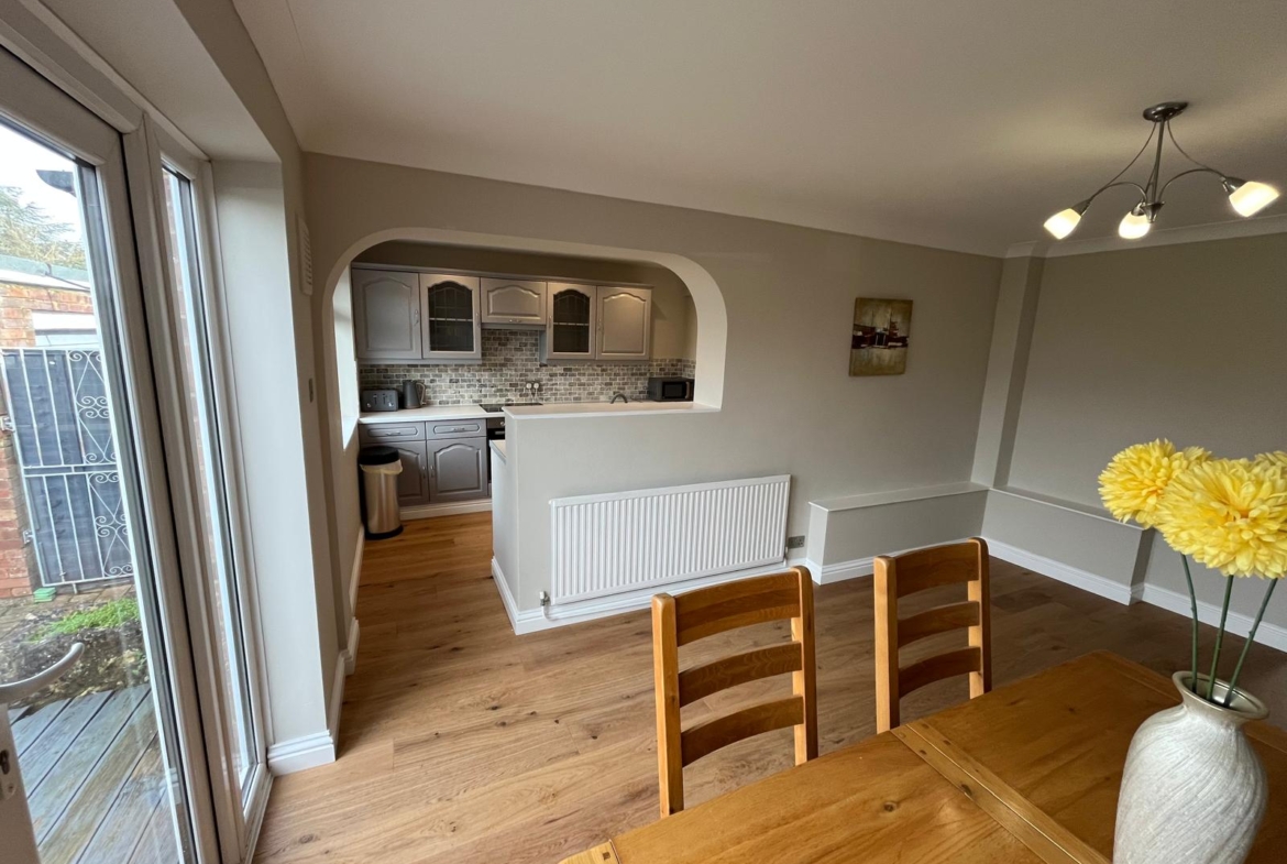 A spacious and light-filled dining space connecting to the kitchen, enjoying pleasant views over the rear garden with large patio doors.