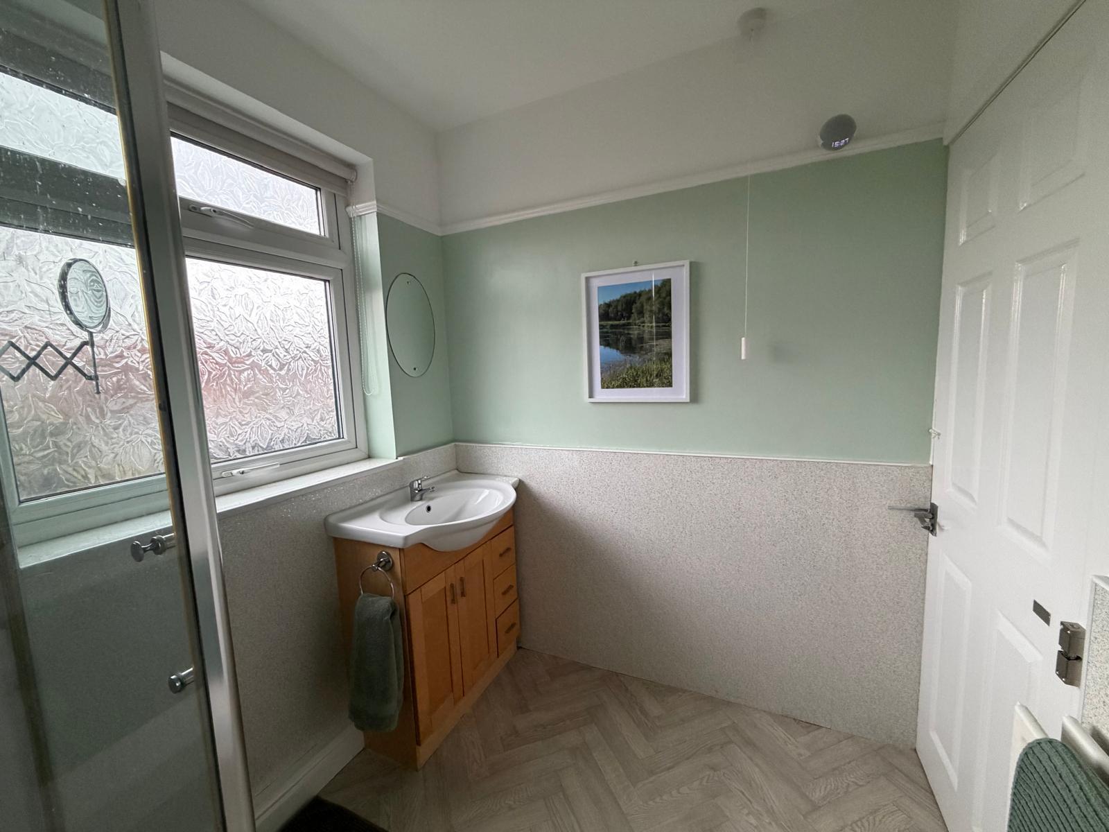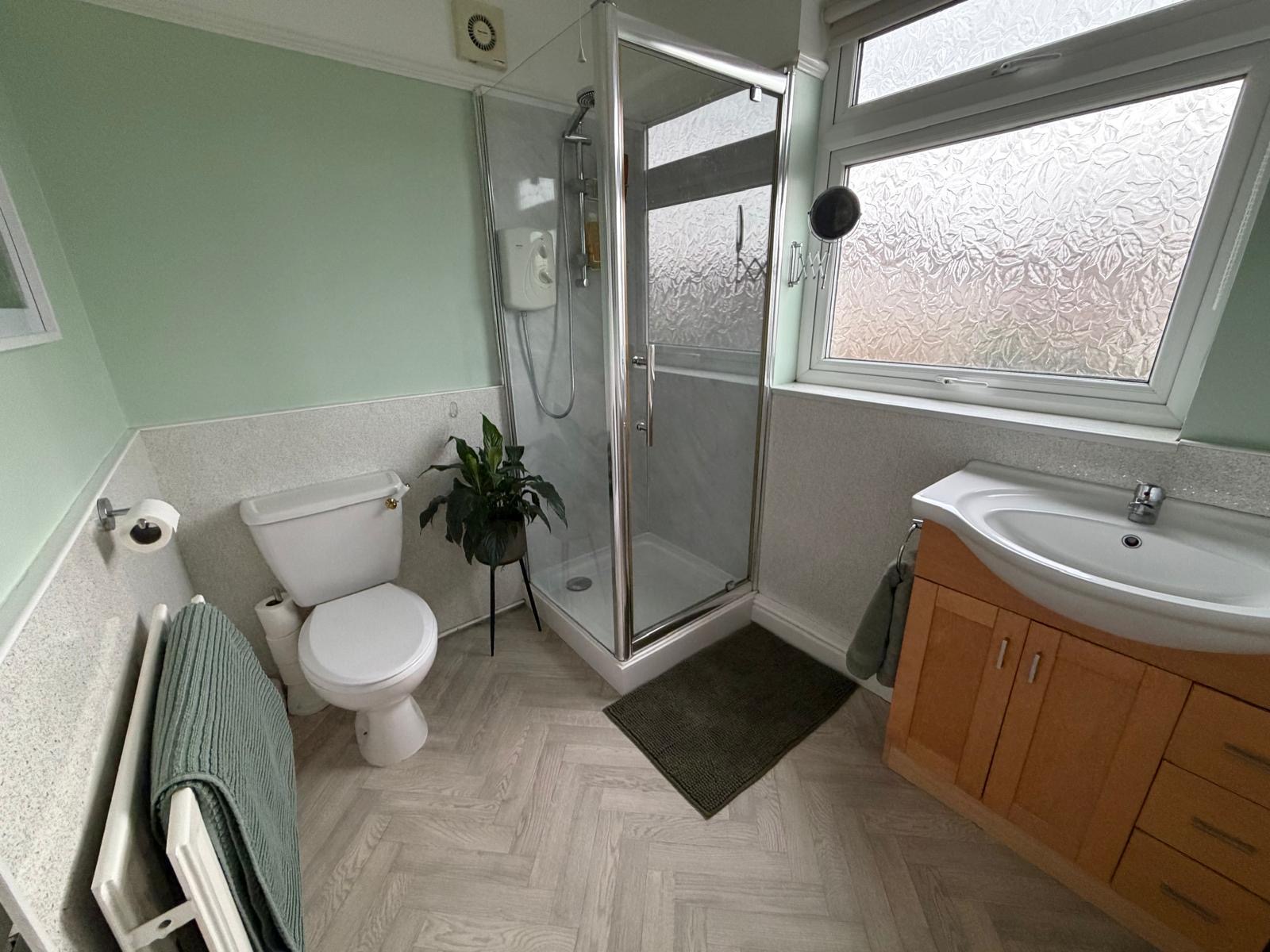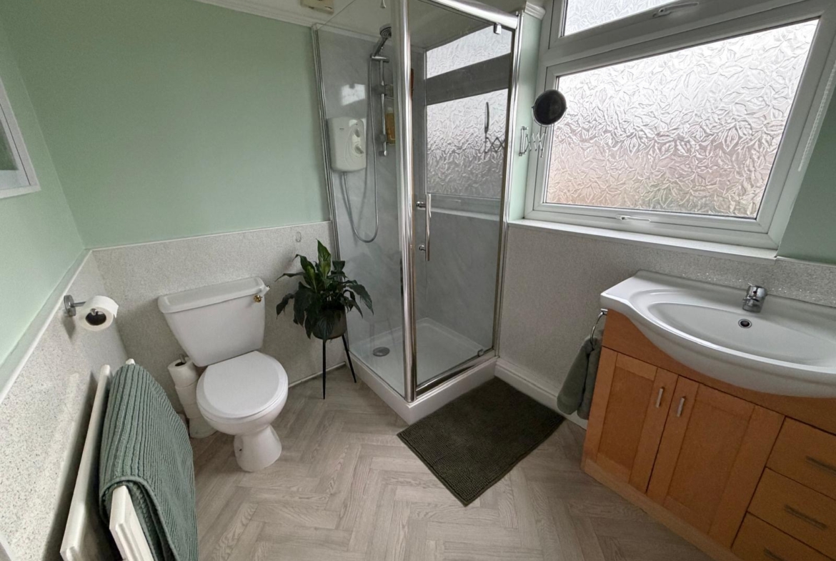 Bathroom – 2.49 x 1.90 (8’3” x 6’3”) – electric shower, glass shower screen, wc, vanity unit with cupboard and draws, radiator, upvc window to rear aspect.