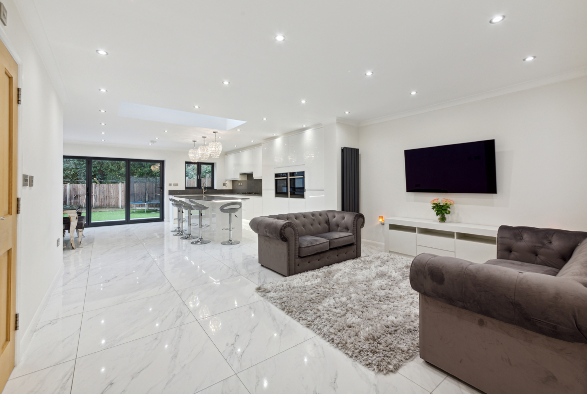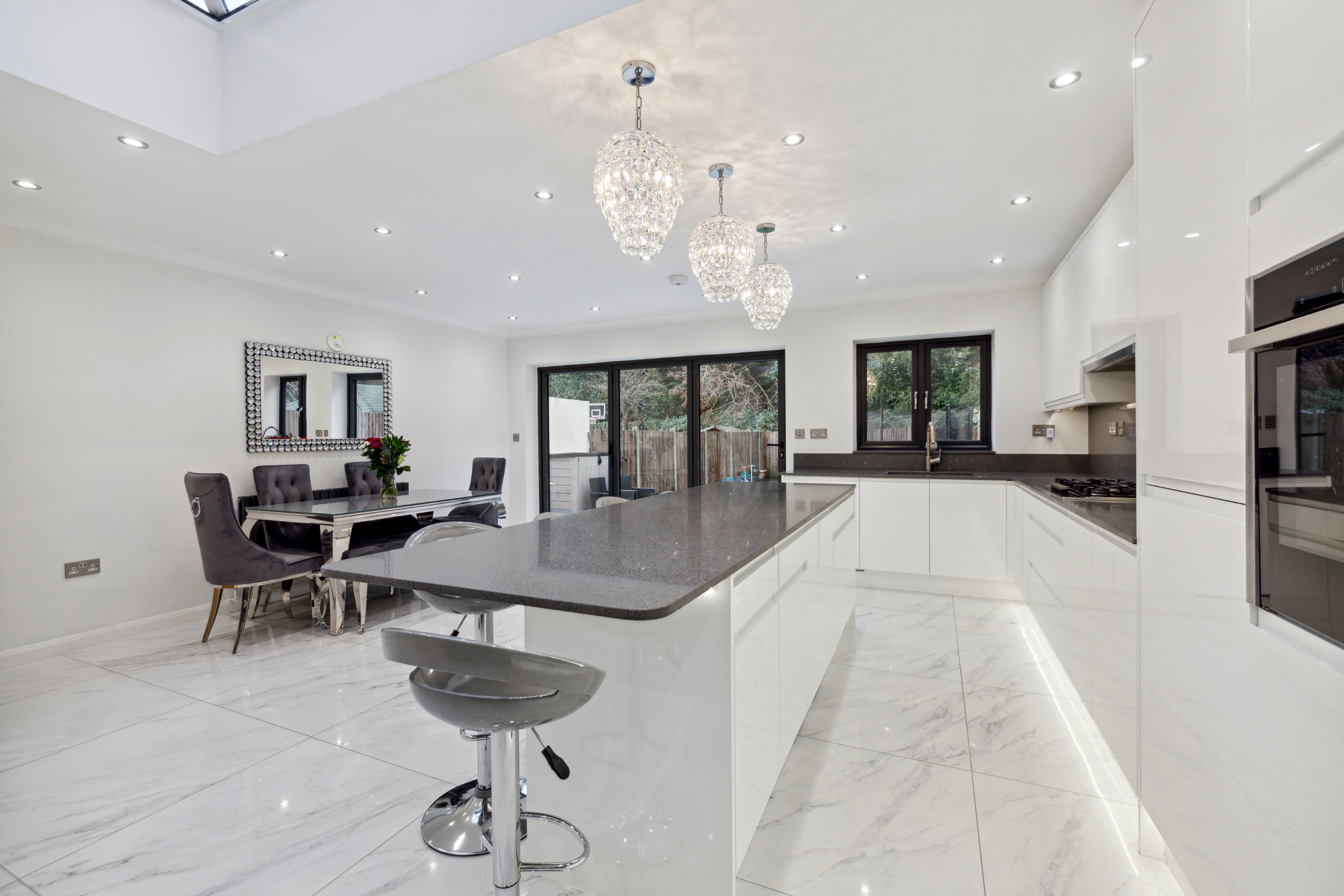 The heart of this home is the truly impressive, extended open-plan kitchen and dining room, which measures a remarkable length and high quality finish. This expansive space is perfect for entertaining and daily family gatherings, with ample room for a large dining table and plenty of seating around the impressive island. High-end integrated appliances are fitted throughout. The skylight and bi-fold doors create a bright, warm and beautiful space. A smartly installed en-suite bathroom and dedicated utility space also provide additional comfort and convenience. The bi-fold doors lead out to the carefully landscaped garden, creating a seamless flow between indoor and outdoor living.