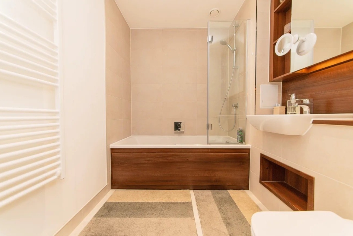 The property is offered furnished ( there are high quality furniture in the flat, a luxury bed worth £3000, a 4k TV, drinking water filter system and a whole-house water softener system ) or unfurnished. There is underfloor heating throughout the property, hardwood flooring in the kitchen/dining/living area, and carpet in the bedroom. Built-in ventilation system to circulate air in the whole flat to prevent mould and dampness. Small walk-in wardrobe/storage room from the bedroom. Double-glazed floor-to-ceiling windows with a gorgeous view of the hill. Video intercom and lifts to the flat. Bike storage is available in the basement of the building. Access to communal roof-top terrace.