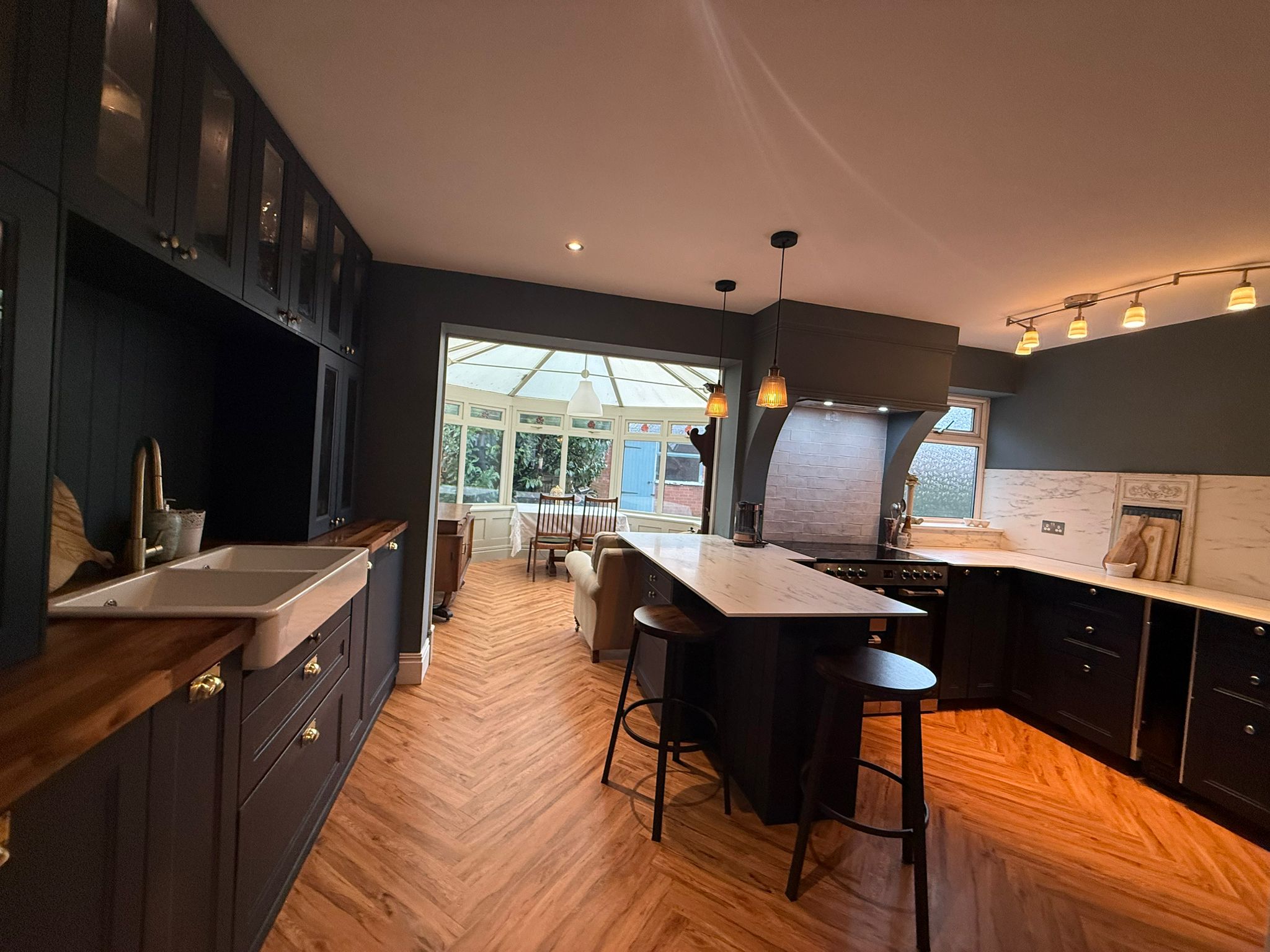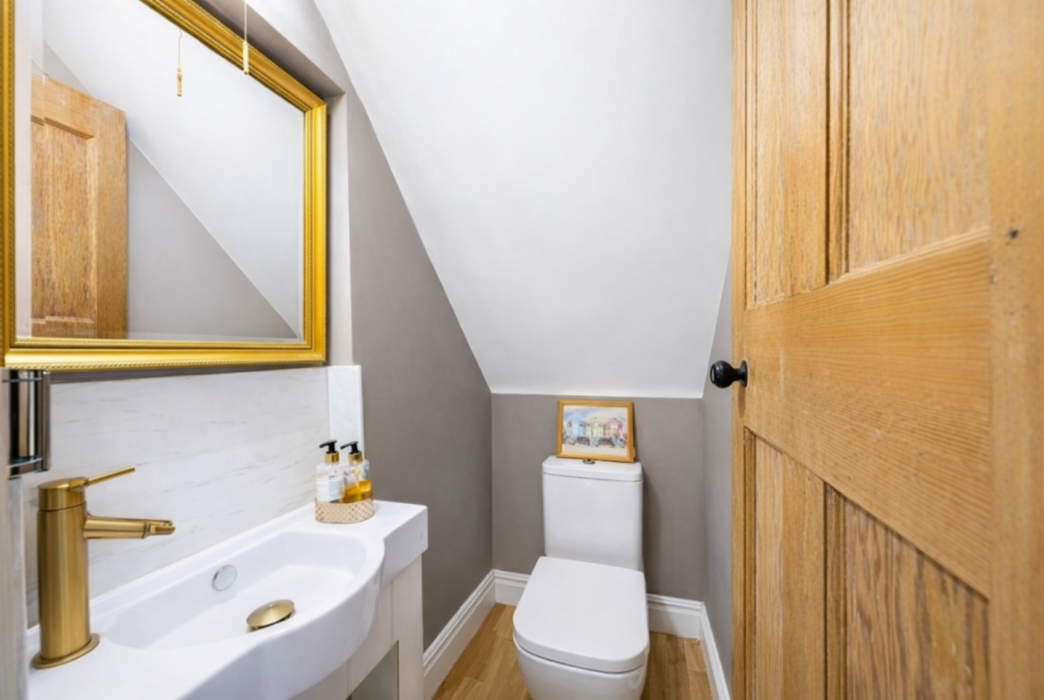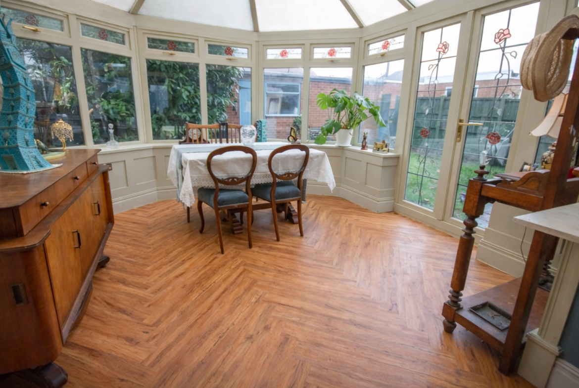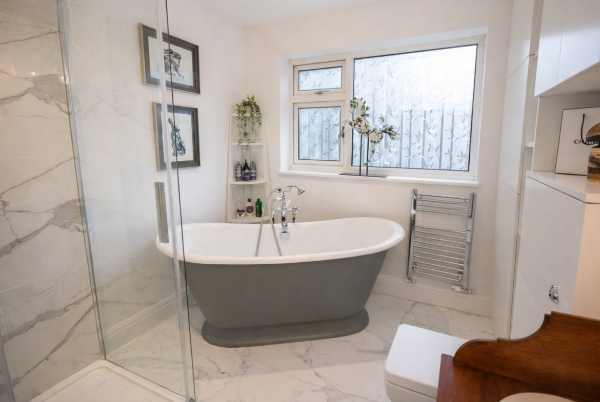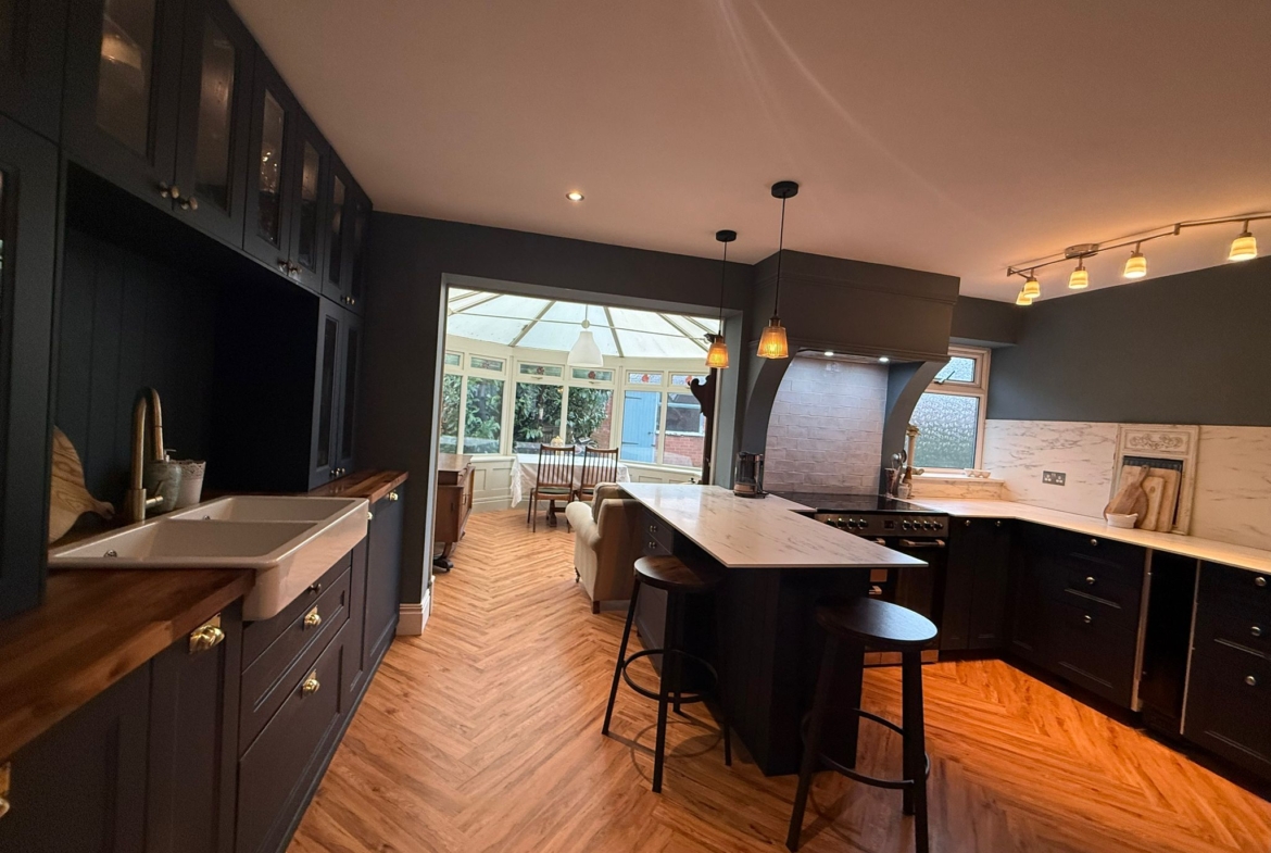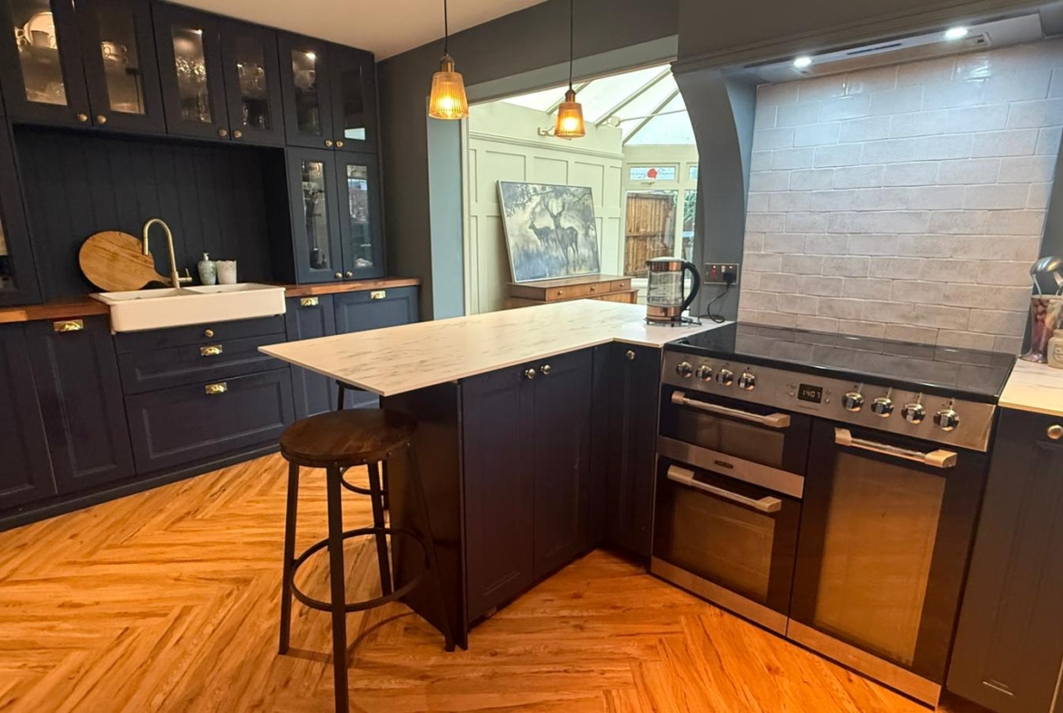 The property is sold with the benefit of no upper chain and features stylishly presented accommodation with double glazing and gas central heating. A spacious and welcoming hallway leads to a spacious open plan kitchen area, with a large and bright conservatory, which functions perfectly as a dining and family room. This newly fitted kitchen with high quality finish, a range oven, and double belfast sink, is complimented by a downstairs utility.  There is also a fabulous main bathroom with a freestanding cast iron bath, and walk in shower, along with underfloor heating and masses of storage.