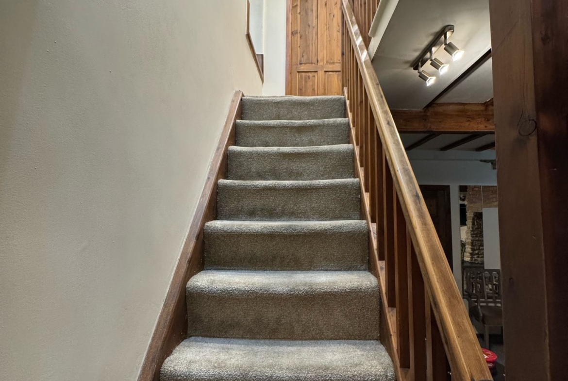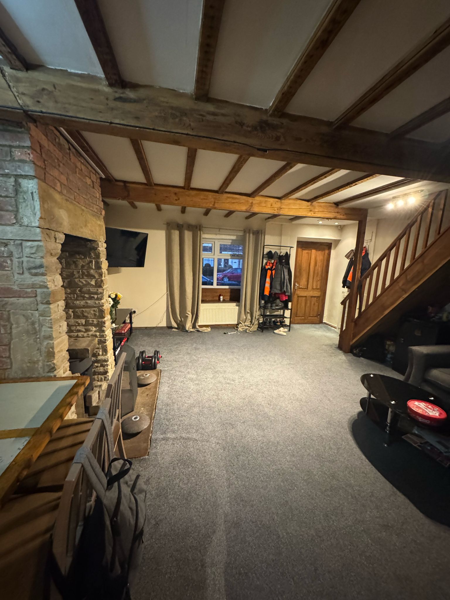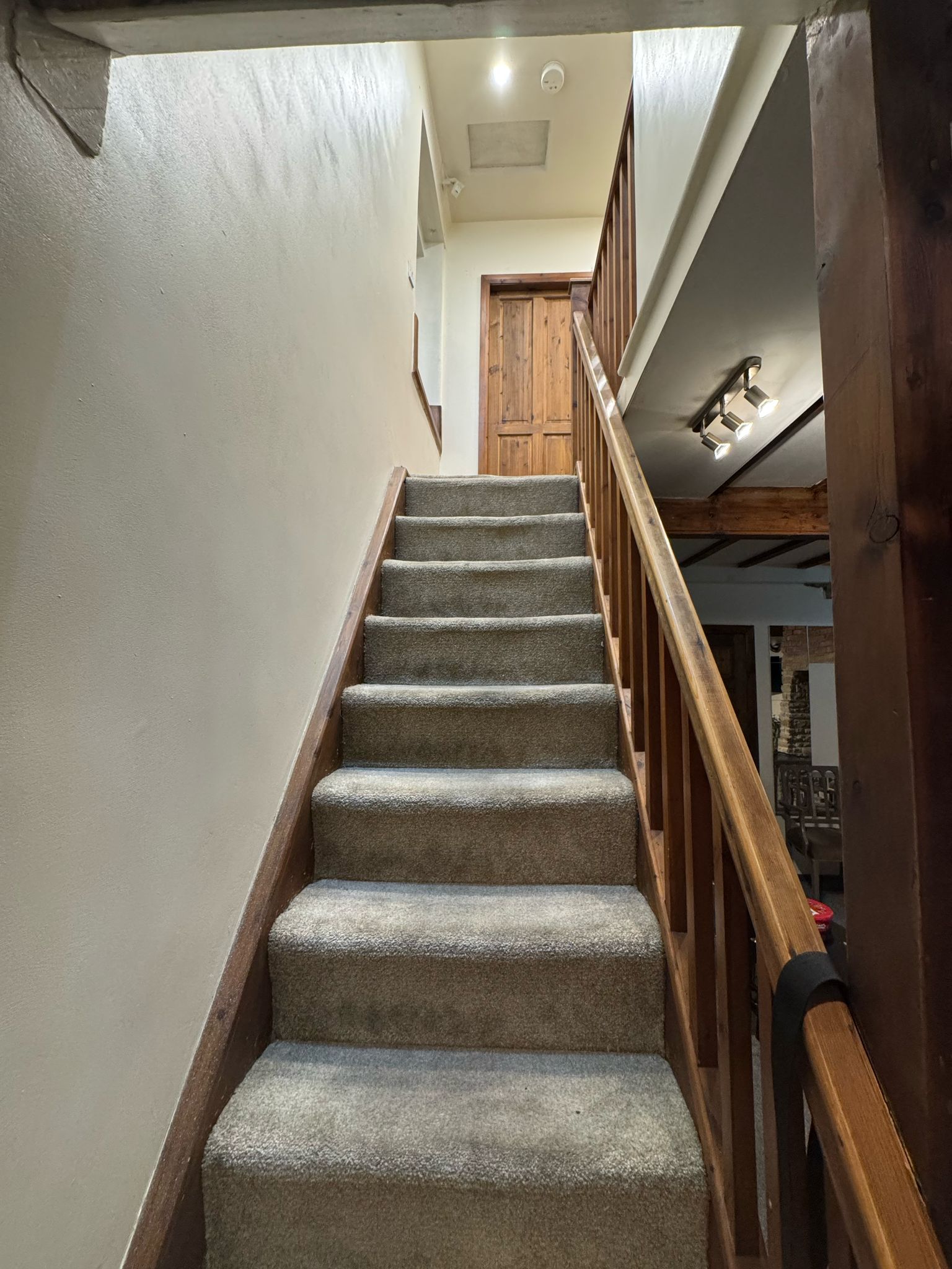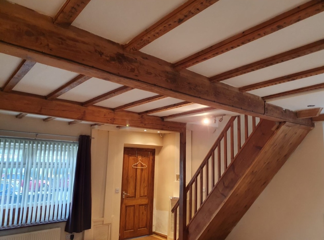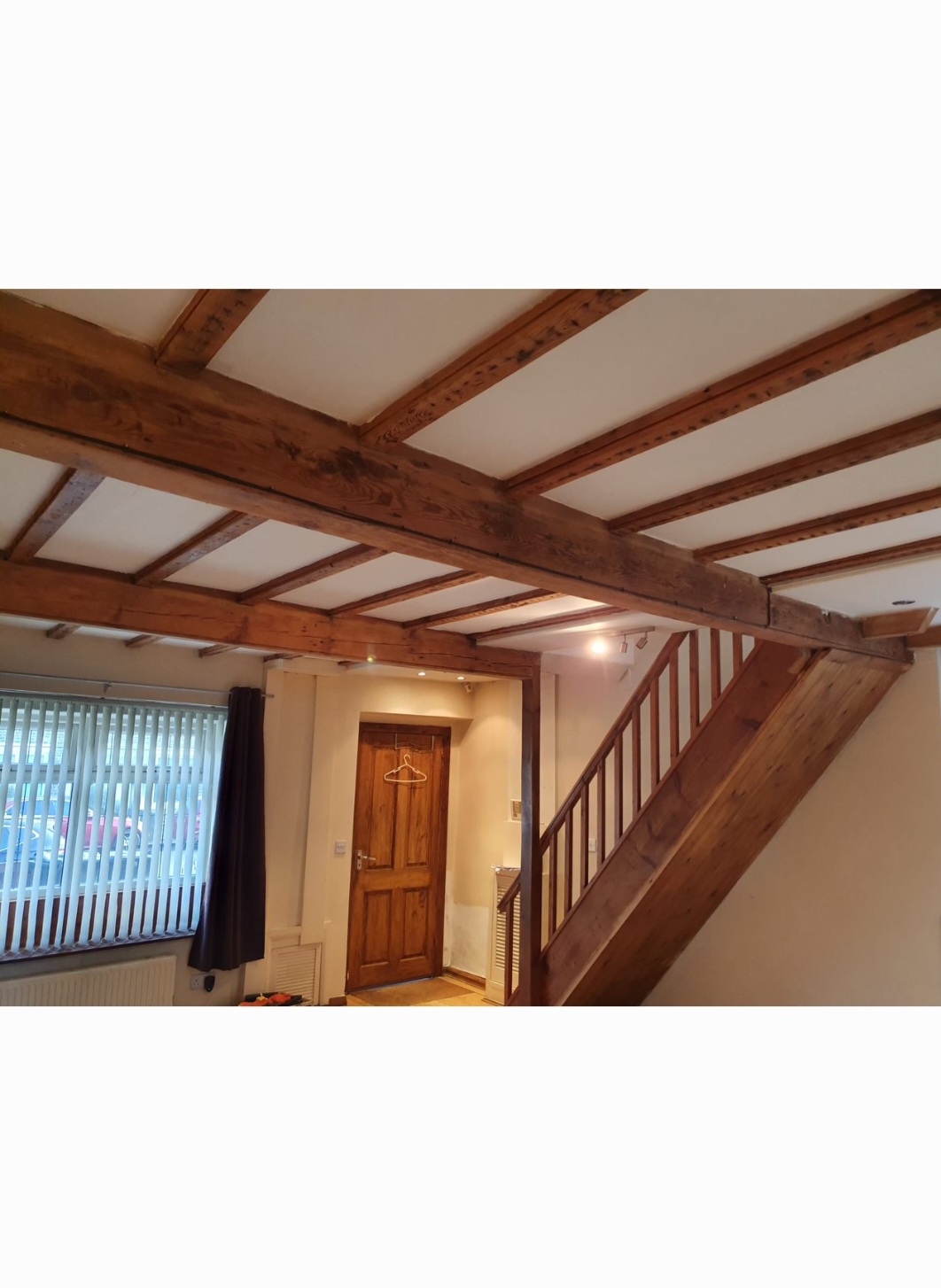 Exposed beams and real wooden flooring (currently protected by high-quality carpets, removable if preferred)