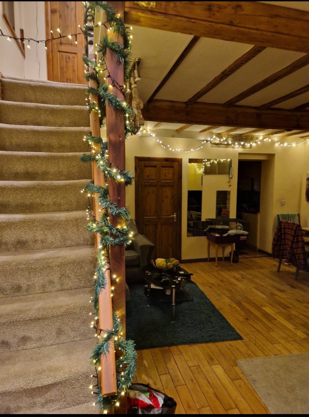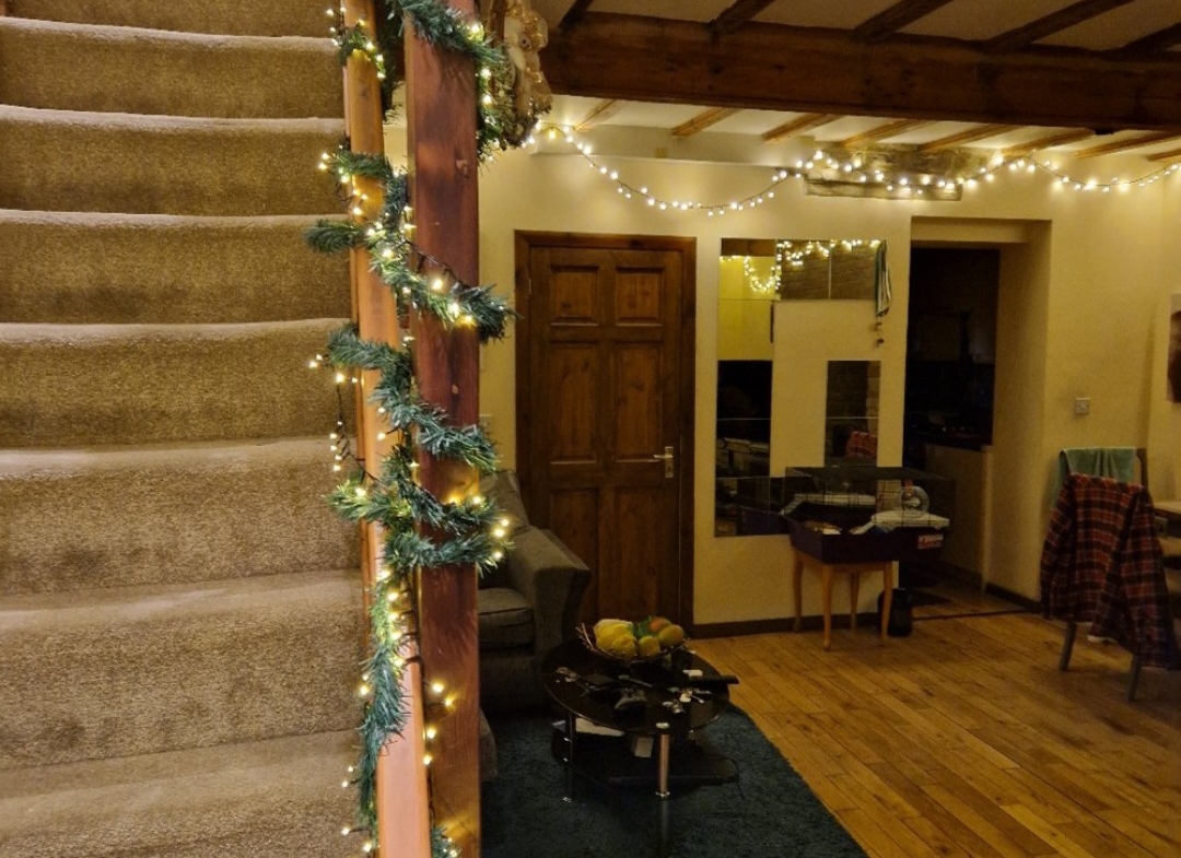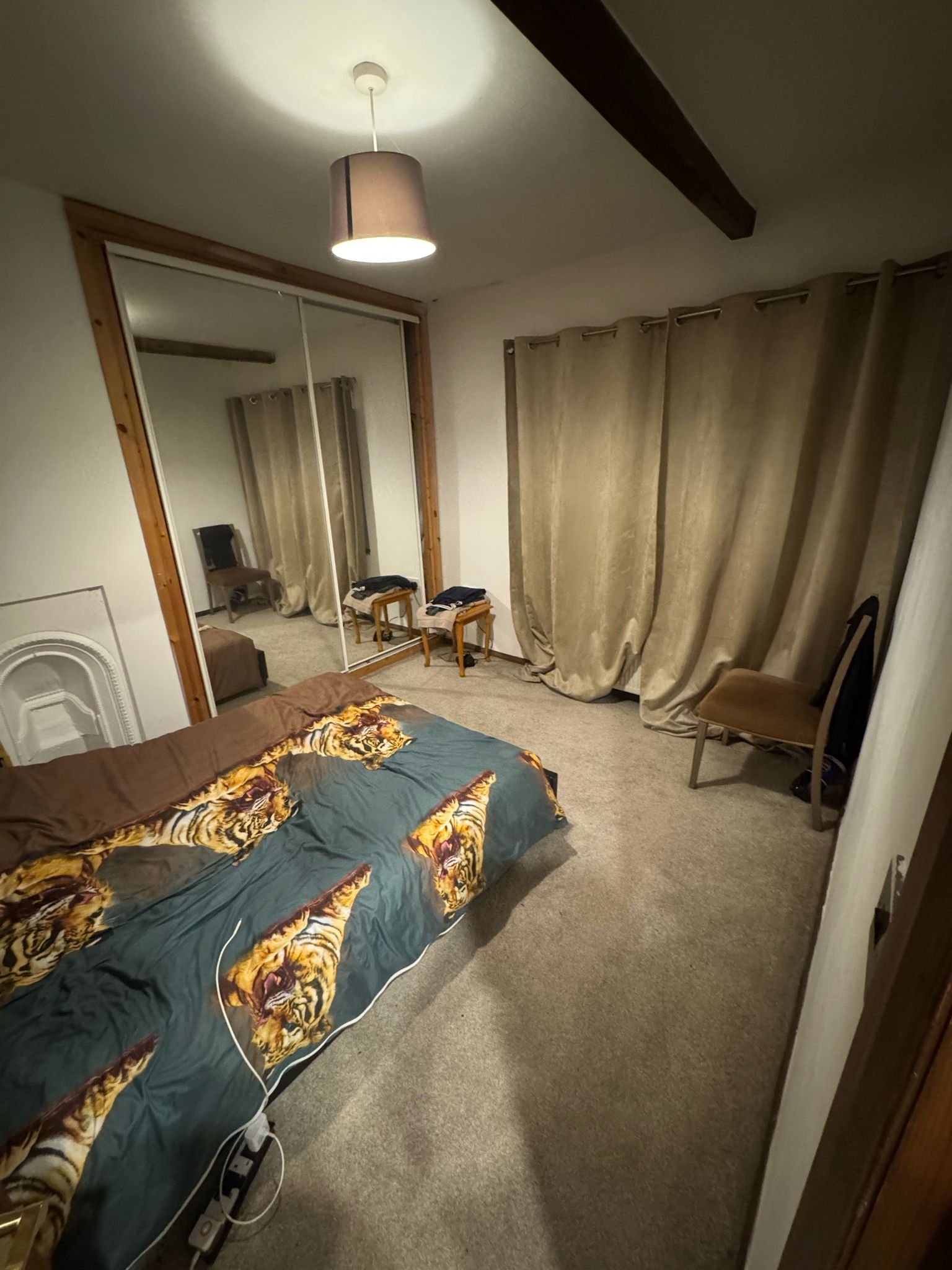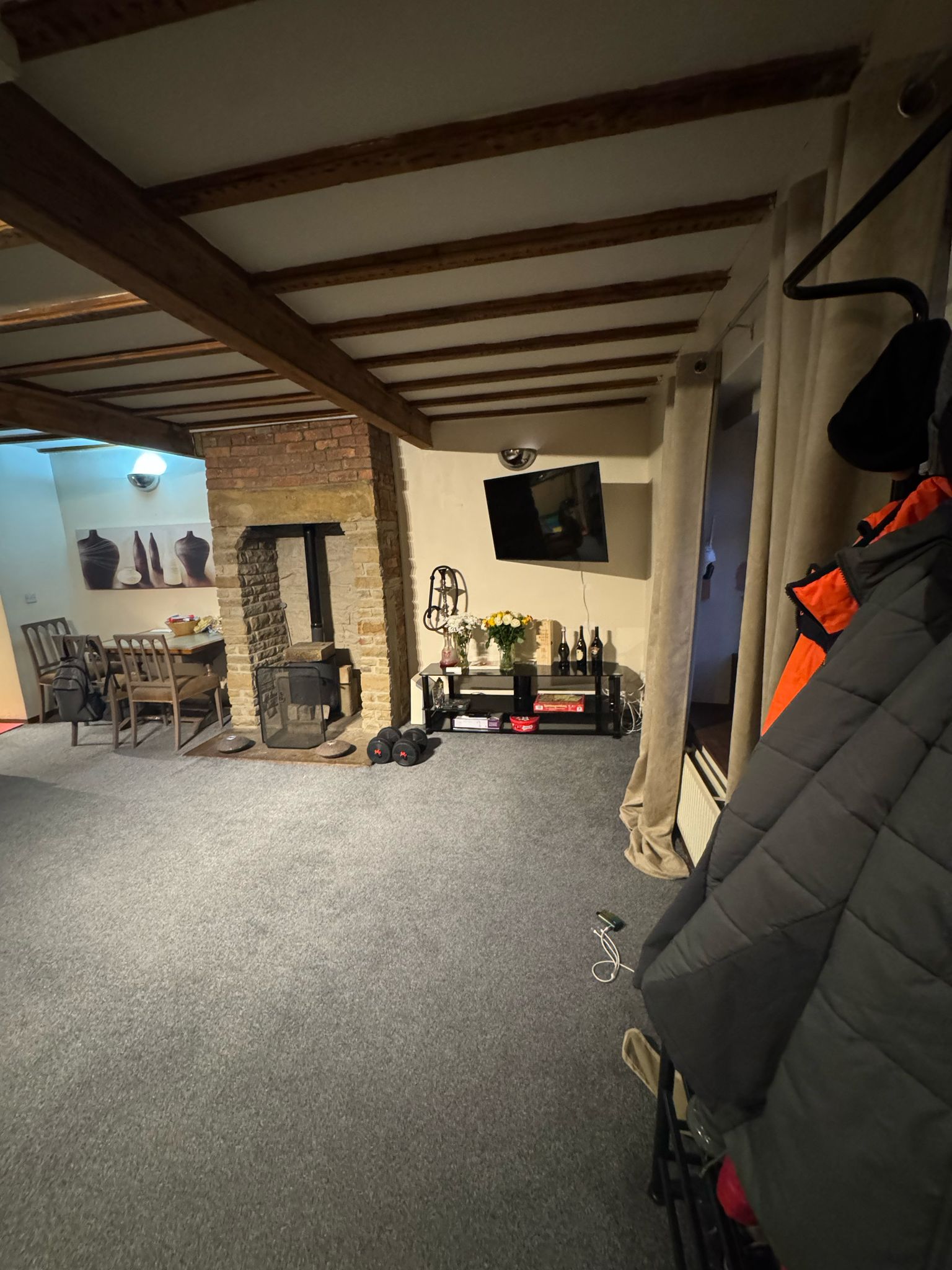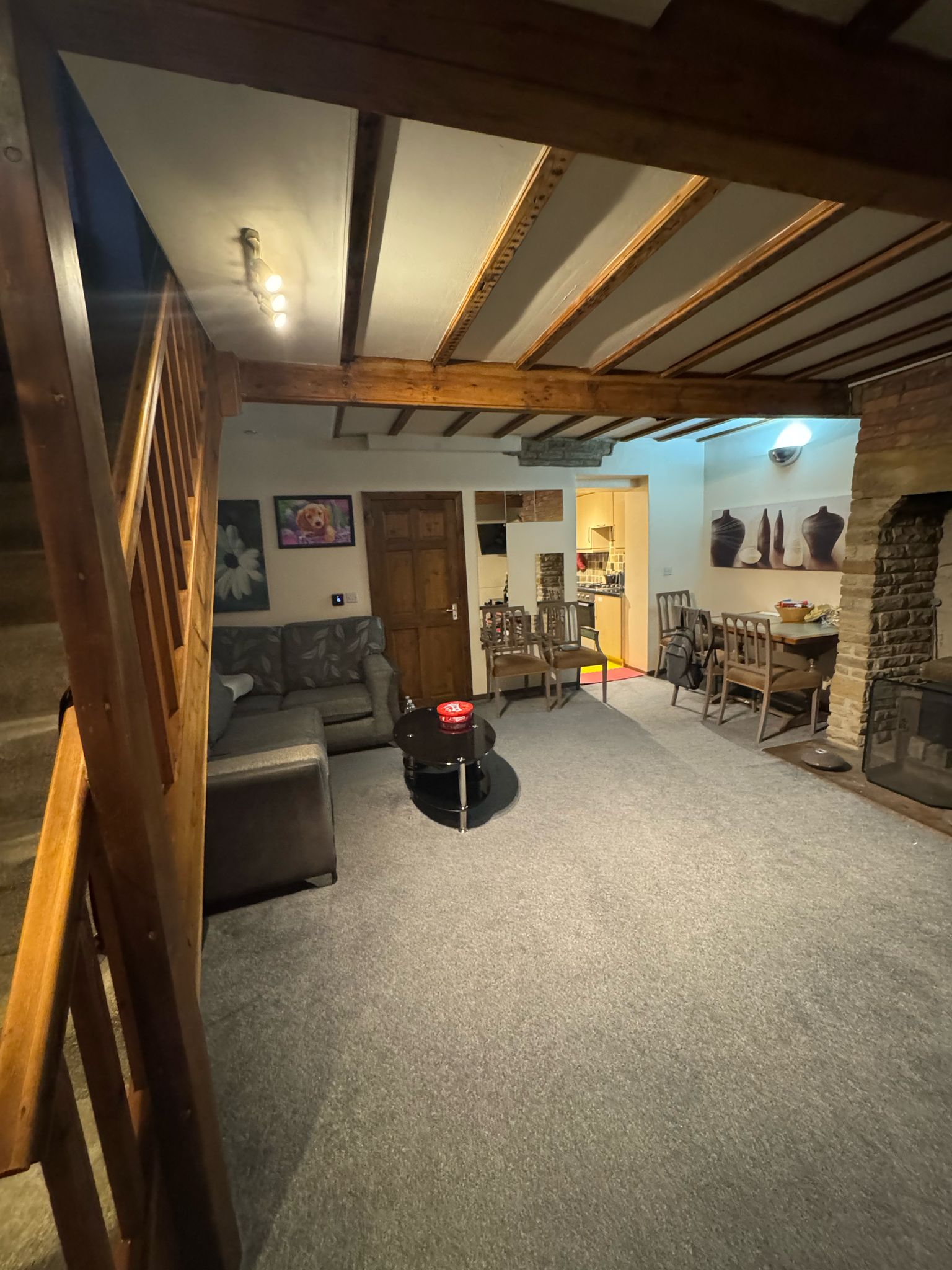 Exposed beams and real wooden flooring (currently protected by high-quality carpets, removable if preferred)