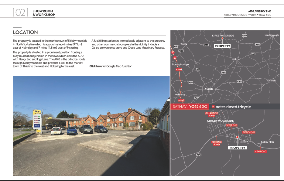 The property is located in the market town of Kirkbymoorside in North Yorkshire which is approximately six miles east of Helmsley and seven miles west of Pickering. The property is situated in a prominent position fronting a busy roundabout junction in the town which links the A170 with Piercy End and Ings Lane. The A170 is the principal route through Kirkbymoorside and provides a link to the market town of Thirsk to the west and Pickering to the east. A fuel filling station sits immediately adjacent to the property and other commercial occupiers in the vicinity include a Co-op convenience store and Grace Lane Veterinary Practice.
