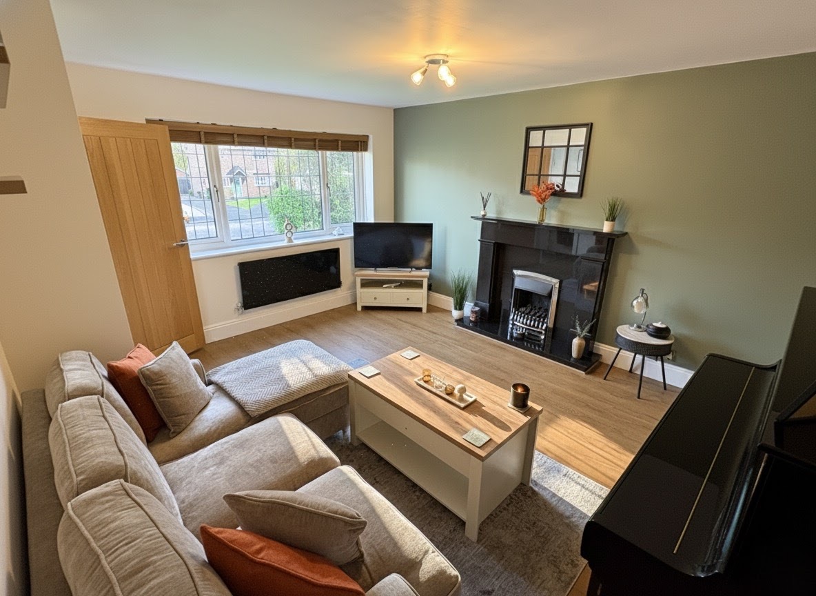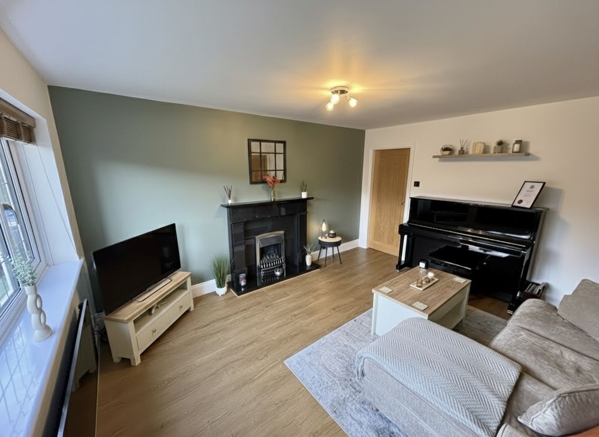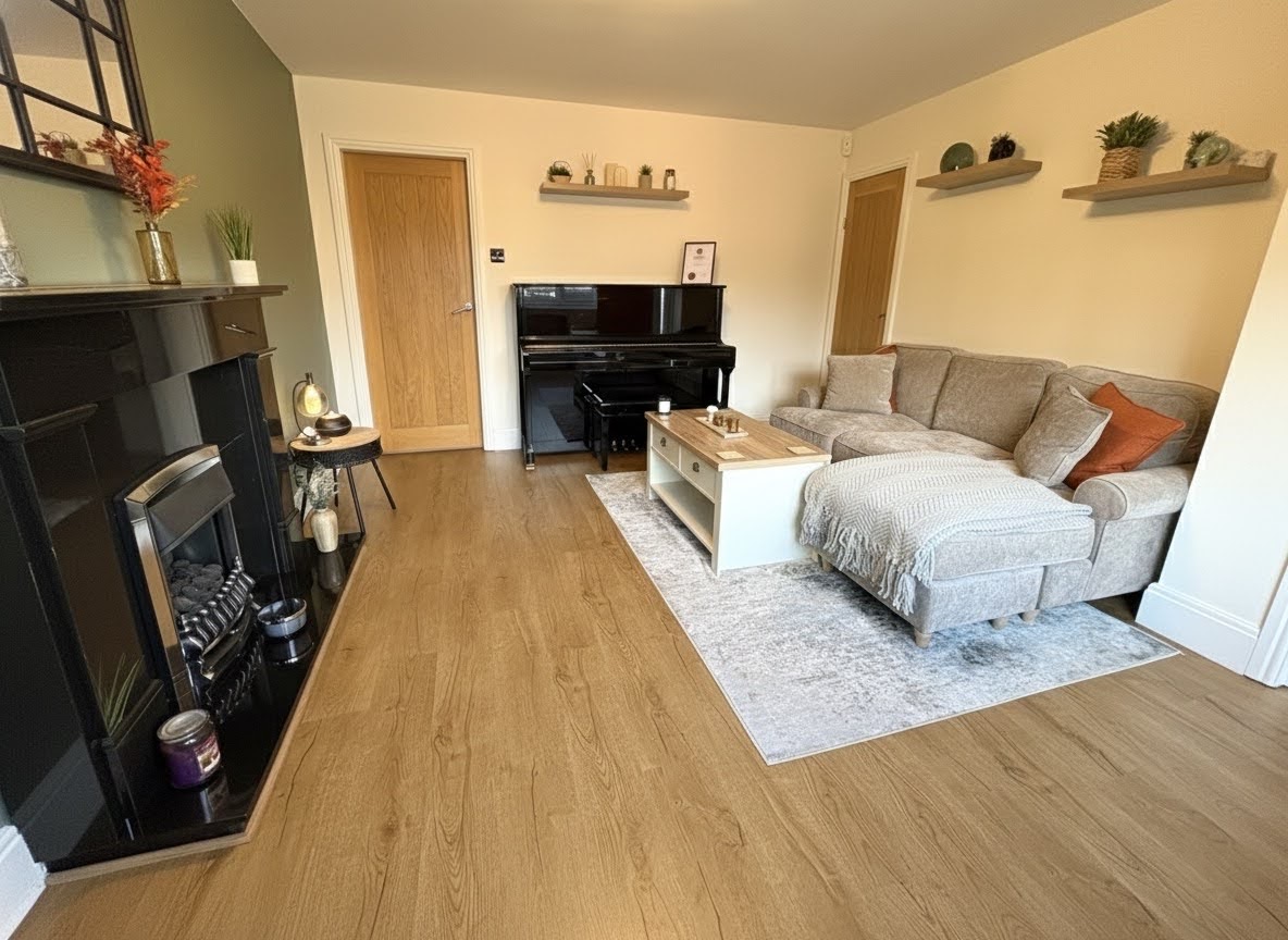 Large double glazed window to the front, vinyl click flooring, marble mantlepiece with open flame gas fire, radiator and under stairs storage cupboard.