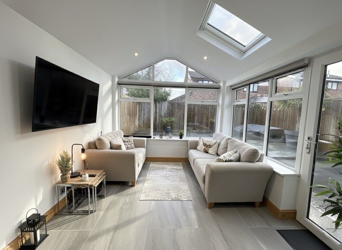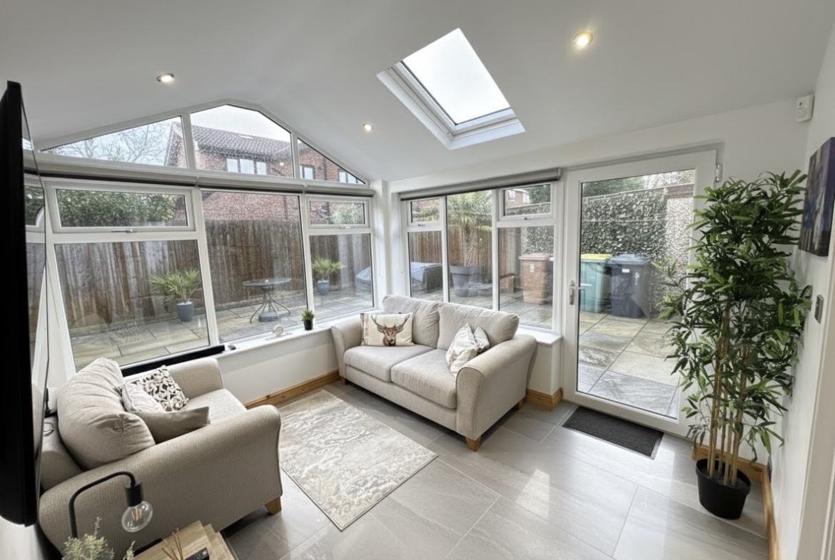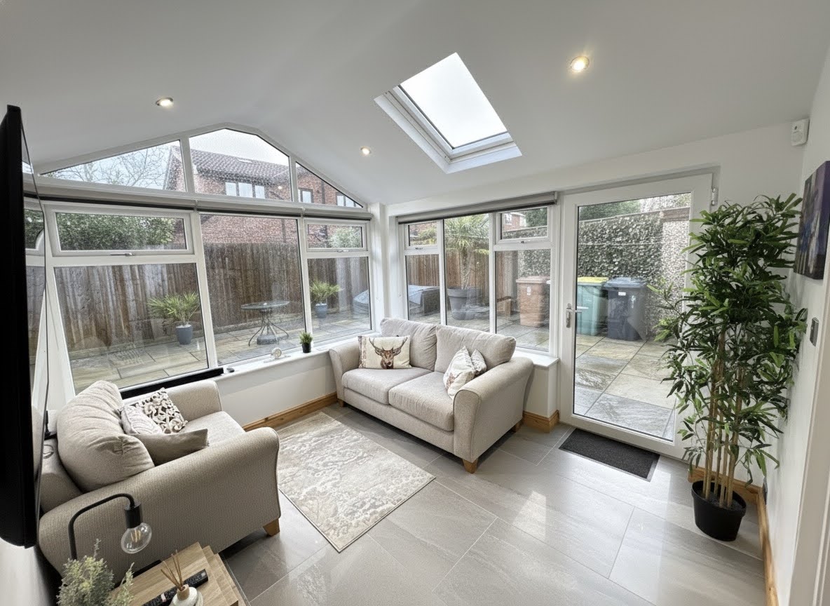Double glazed windows to the side and rear, roof skylight, electric ladder radiator, gloss floor tiles and uPVC door to the side leading into the garden.