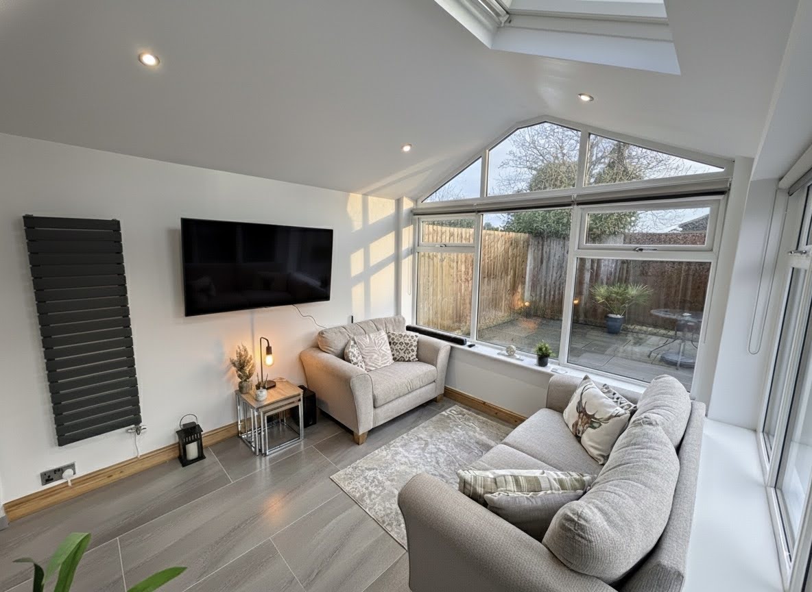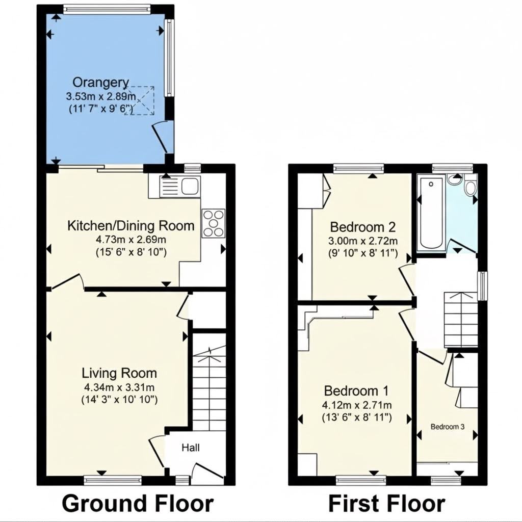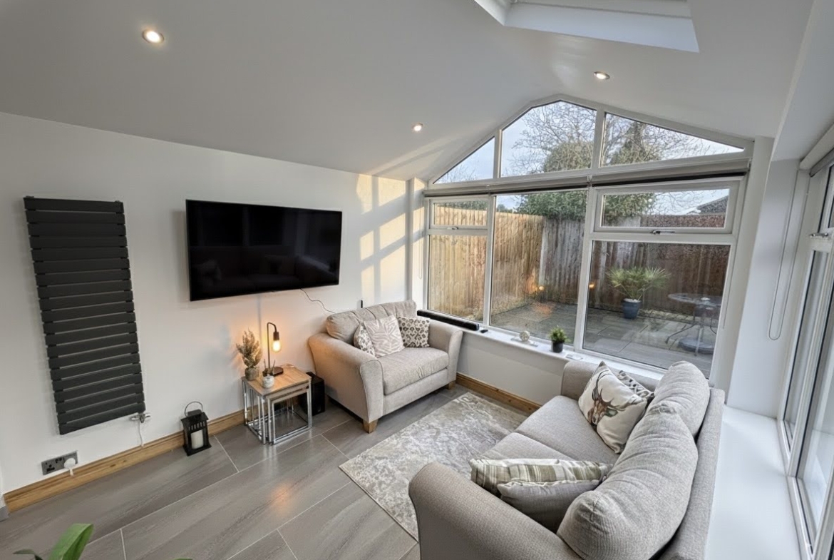 Immaculate extended three bedroom semi detached family home is a credit to its current owner and is presented to a show-home standard throughout. Stepping through the front door into the entrance hall, you are welcomed by a bright and spacious modern living room off to the left, and stairs leading up to the first floor landing. The living room is flooded with natural light from the large front window, and also boasts a marble mantlepiece with open flame gas fire. There is also a door through to an under stairs storage cupboard. Continuing through the home you reach the large, bright and airy open plan dining kitchen, with slate floor, grey gloss painted kitchen cabinets with a wooden effect worktop. There are a range of wall and base units, as well as an integrated dishwasher, built in single oven and a 5 ring gas hob. Following on from the kitchen is the recently built orangery flooded with natural light from the abundance of windows and roof skylight, fitted with a modern electric ladder radiator and mounted TV bracket.