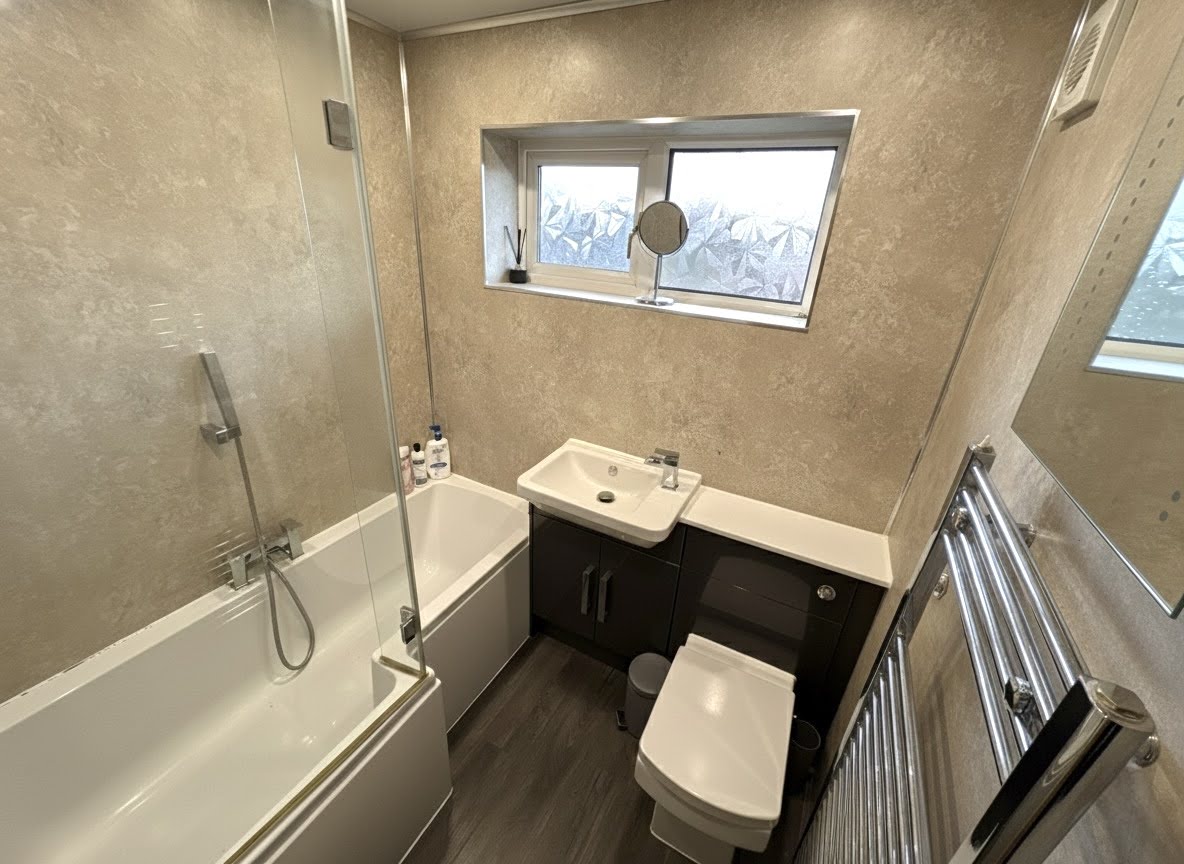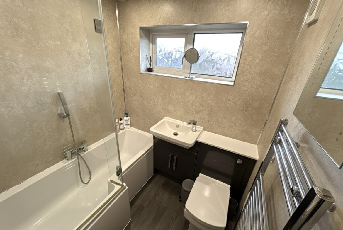 Luxury three piece suite bathroom comprising bath with electric shower over, wash basin with vanity unit, push button integrated WC, laminate flooring, heated towel rail and a motion sensor light up mirror.
