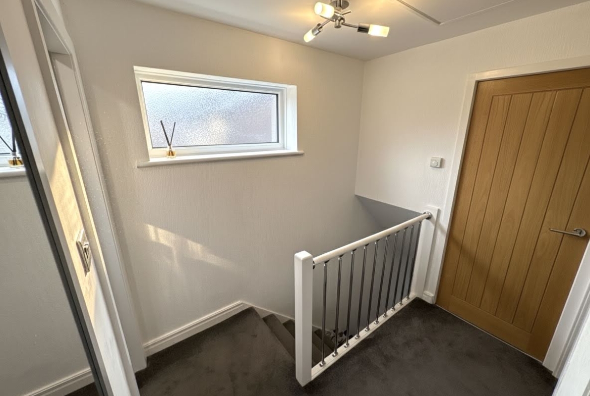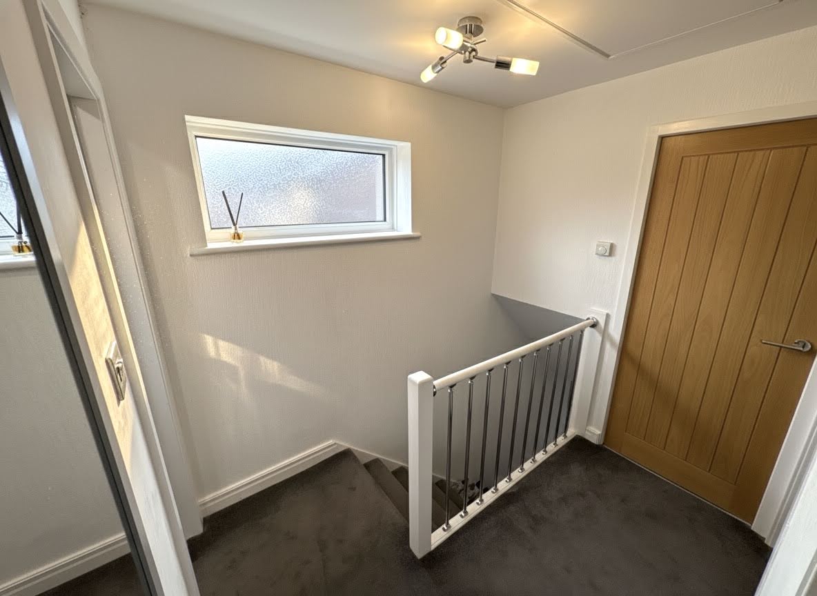 Staircase leads from the downstairs entrance hall up to a bright and airy first floor landing. Double glazed window to the side, and access to the converted loft from the pull down ladder hatch.