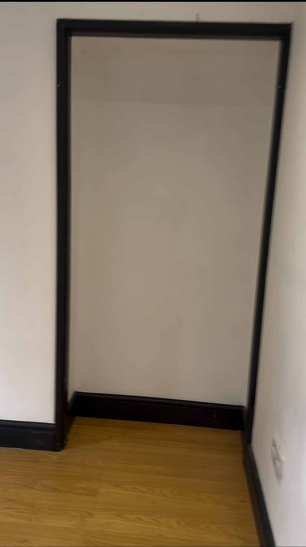 • Left of door: 986 mm recess, 350 mm deep, then 1800 mm wall