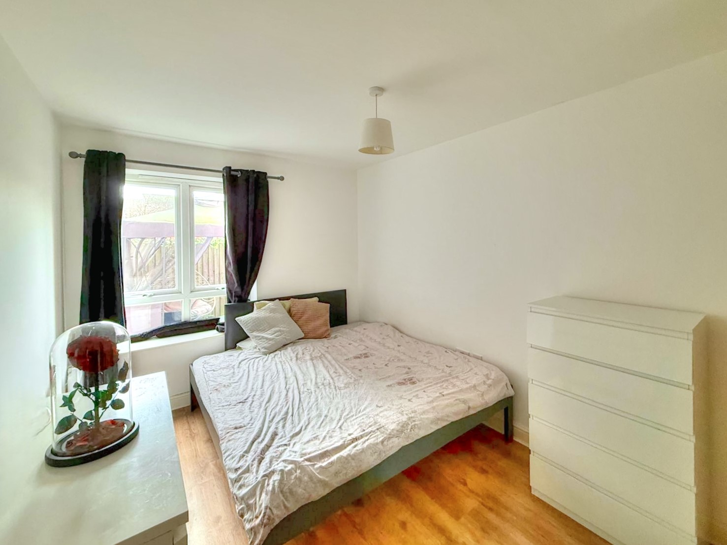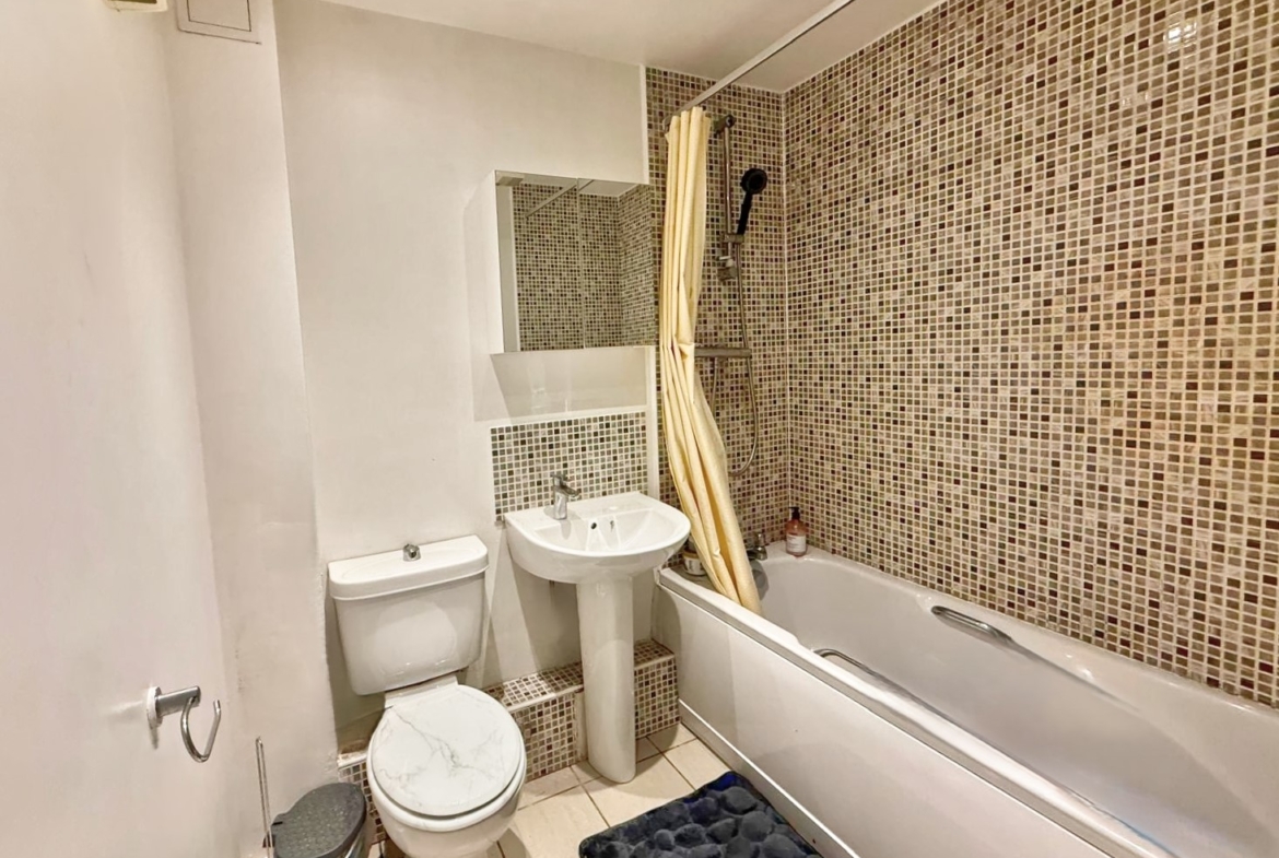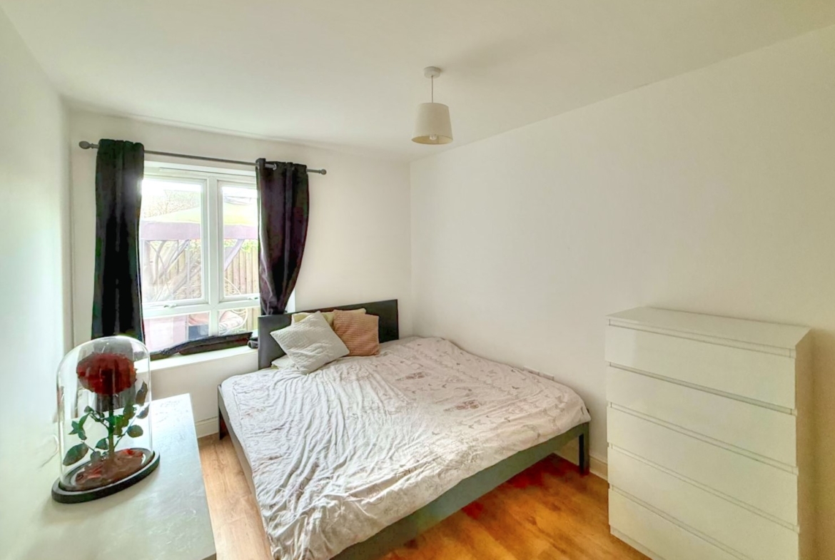 Both bedrooms are generously sized doubles, offering plenty of room for wardrobes and additional furniture. The bathroom is well-appointed with modern fixtures and a clean, neutral décor. The apartment’s ground-floor position means easy access without the need for stairs, adding to its appeal for a wide range of buyers.