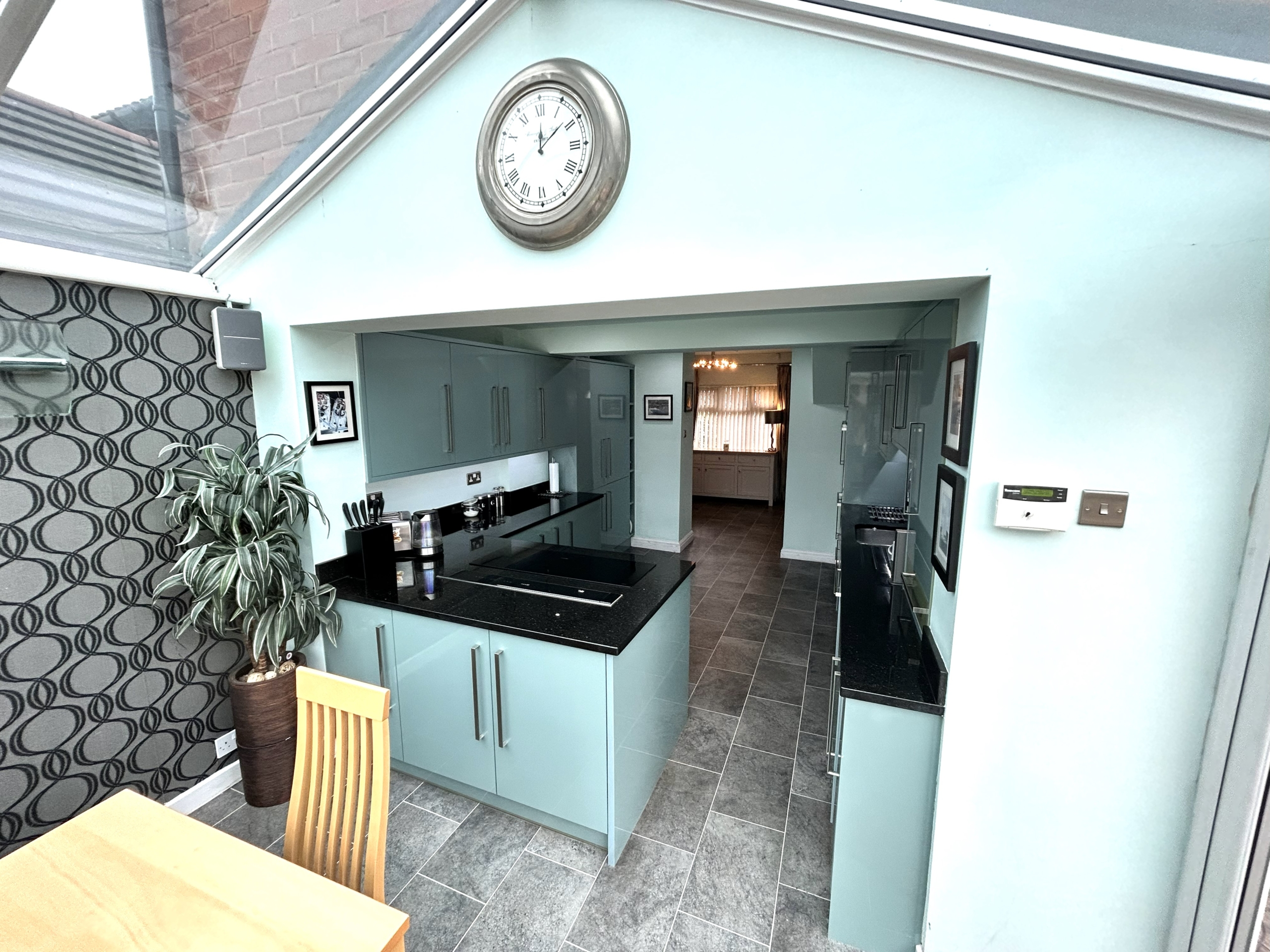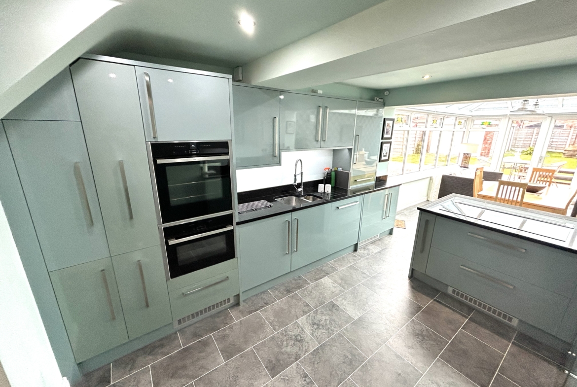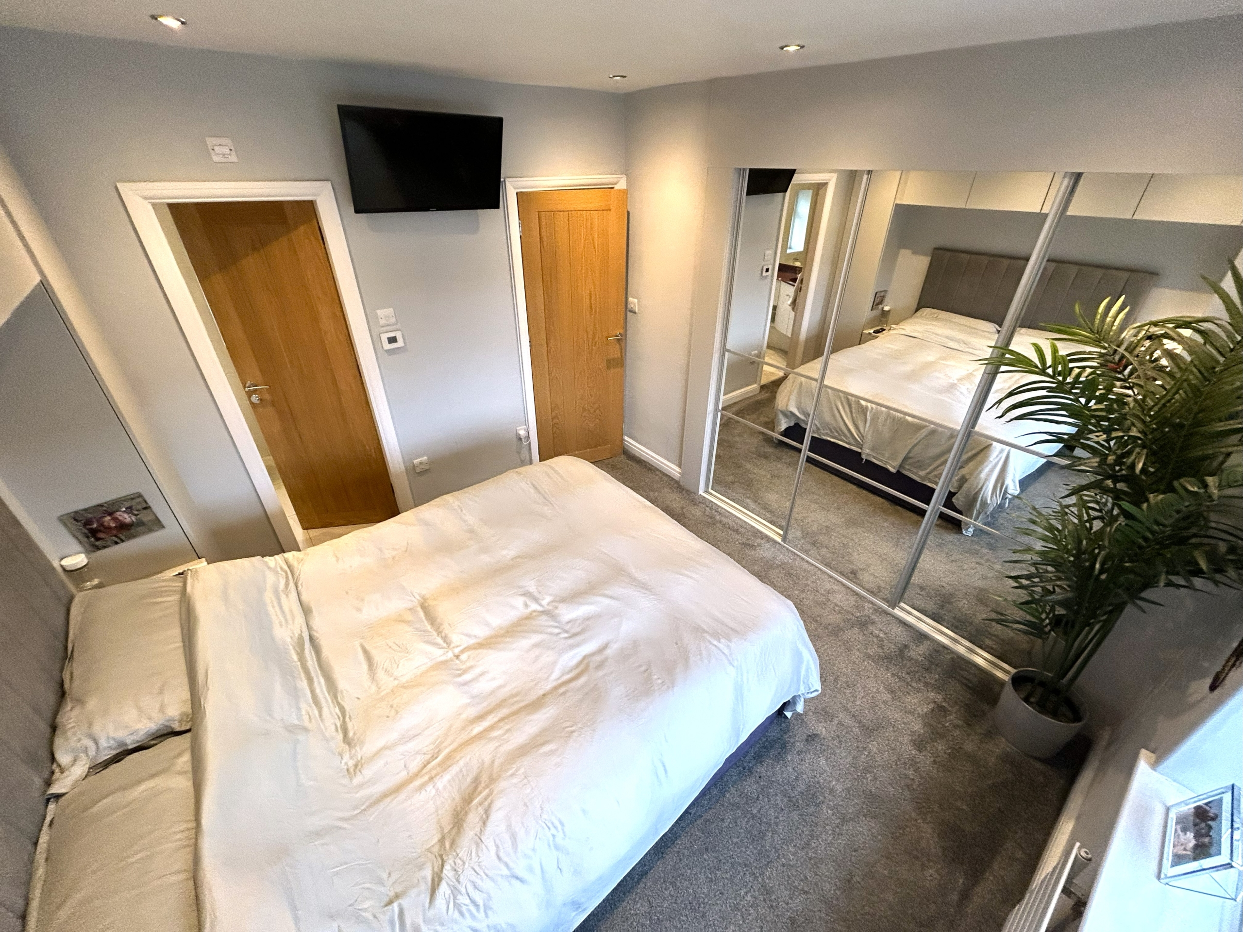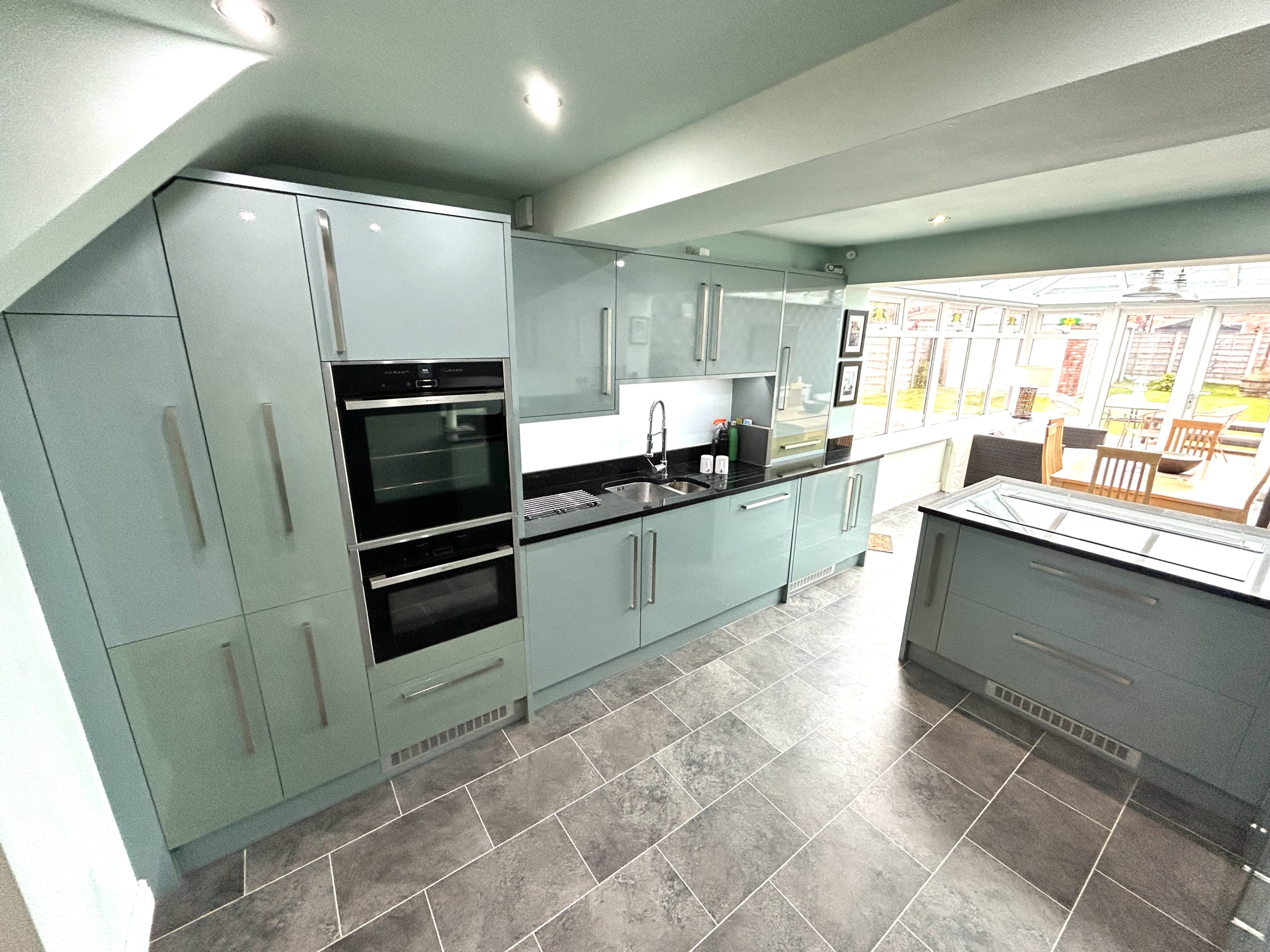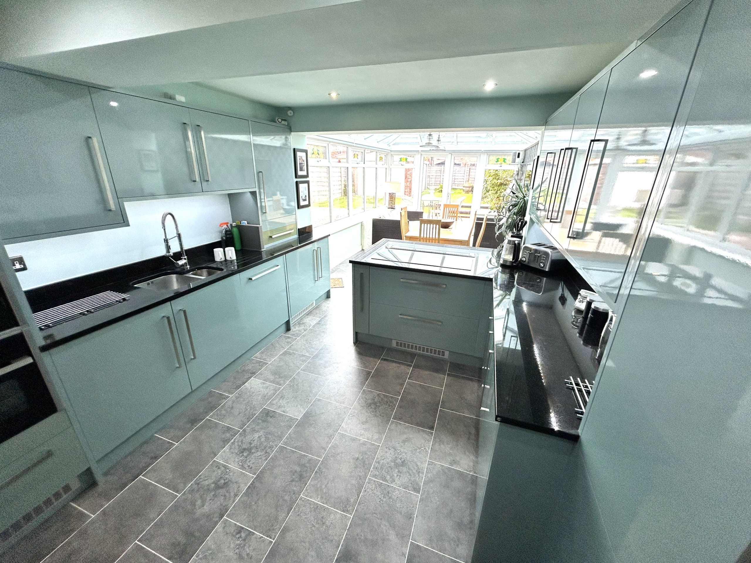 The kitchen has been designed to a high modern standard with plenty of countertop space and high-quality built-in appliances. The space flows nicely into the conservatory / dining area with remote control motorised blinds and on through double doors which lead you out to a decked area and the large rear garden.  There is also a side door for access to the bin store area, rear gate and driveway.