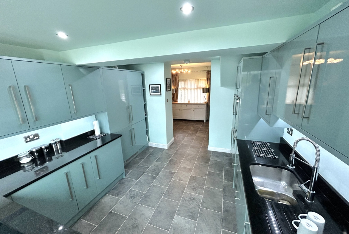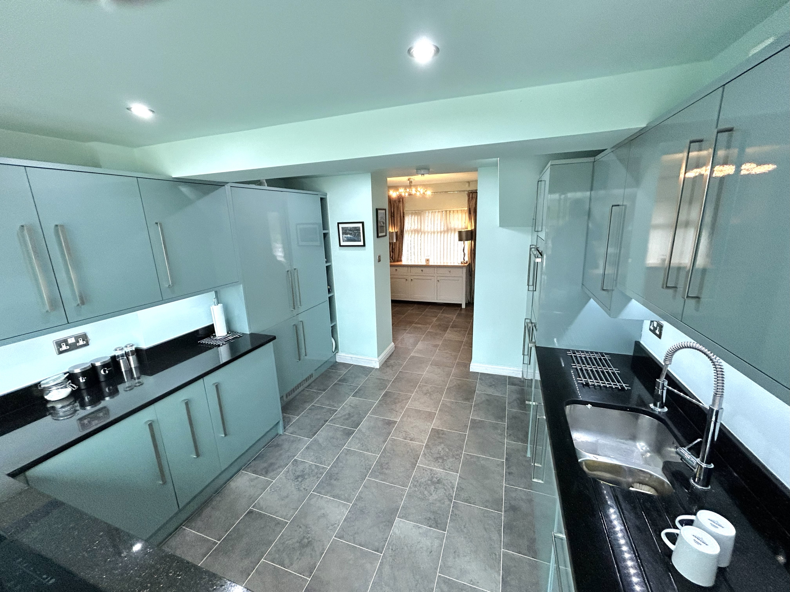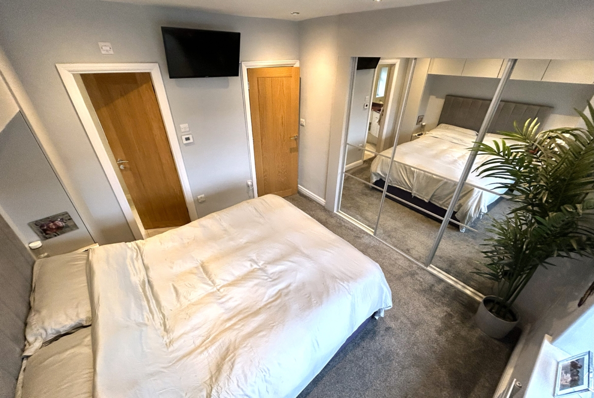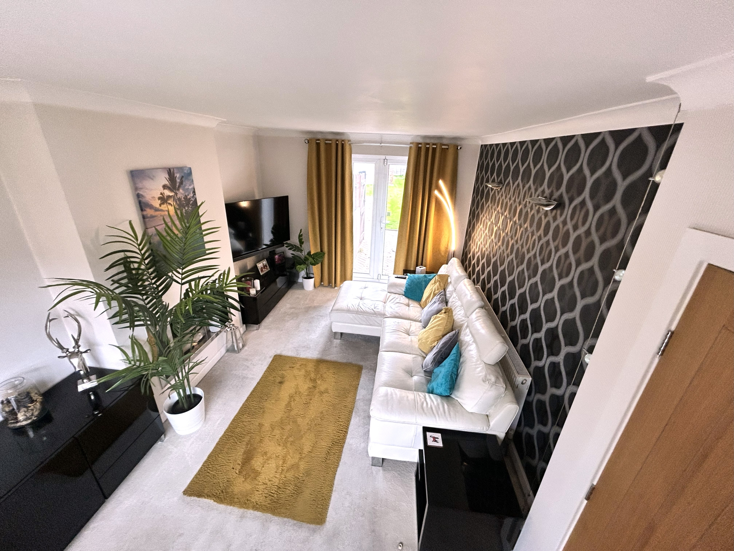 The kitchen has been designed to a high modern standard with plenty of countertop space and high-quality built-in appliances. The space flows nicely into the conservatory / dining area with remote control motorised blinds and on through double doors which lead you out to a decked area and the large rear garden.  There is also a side door for access to the bin store area, rear gate and driveway.