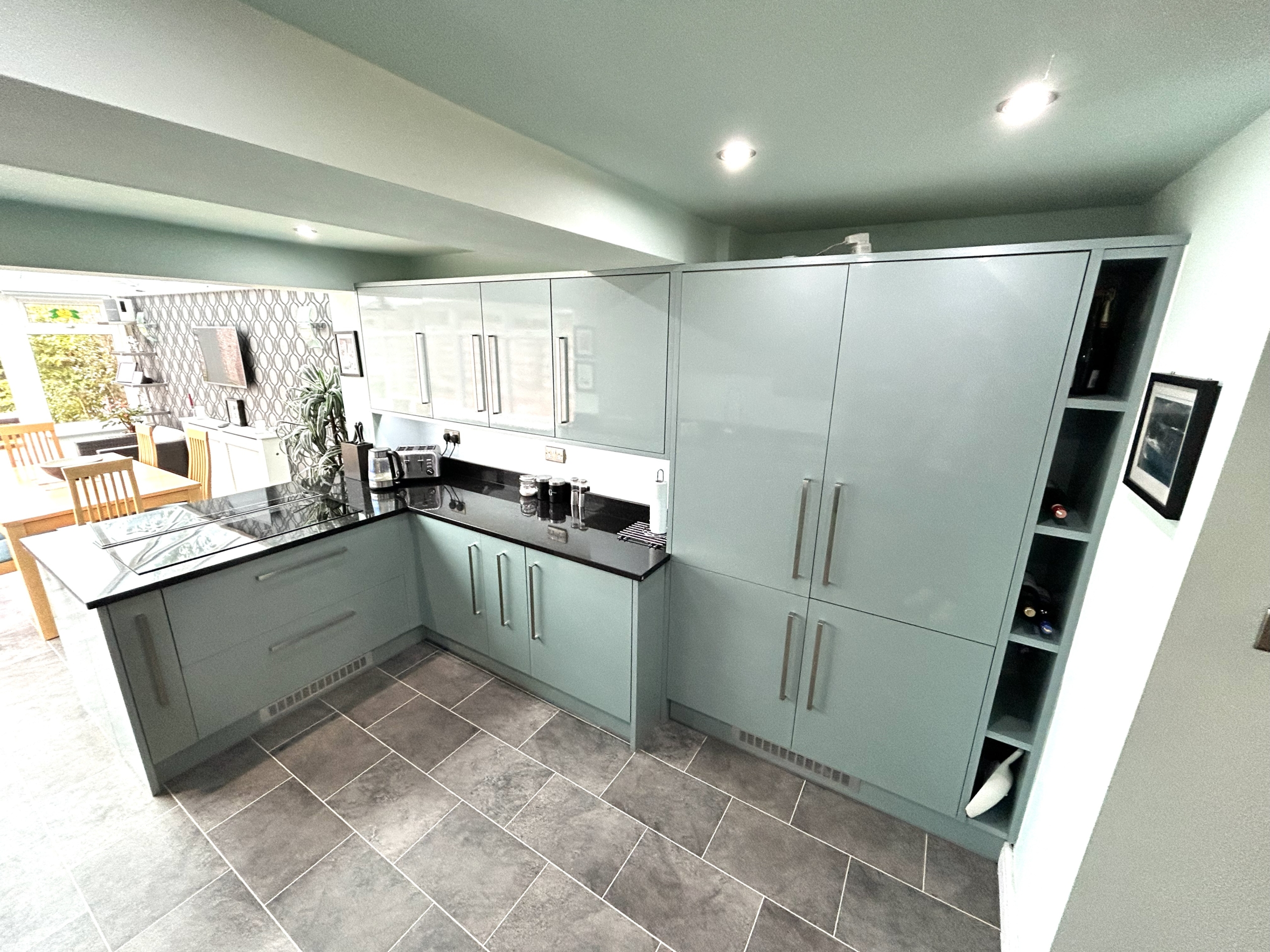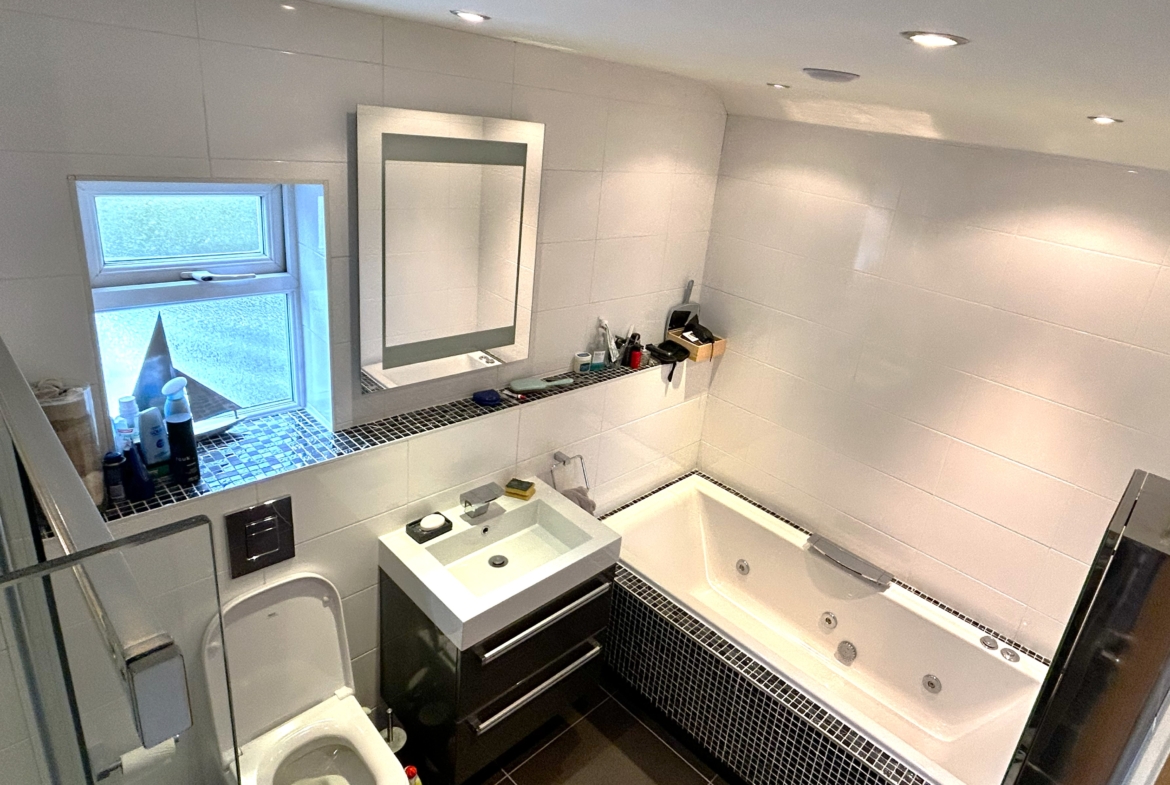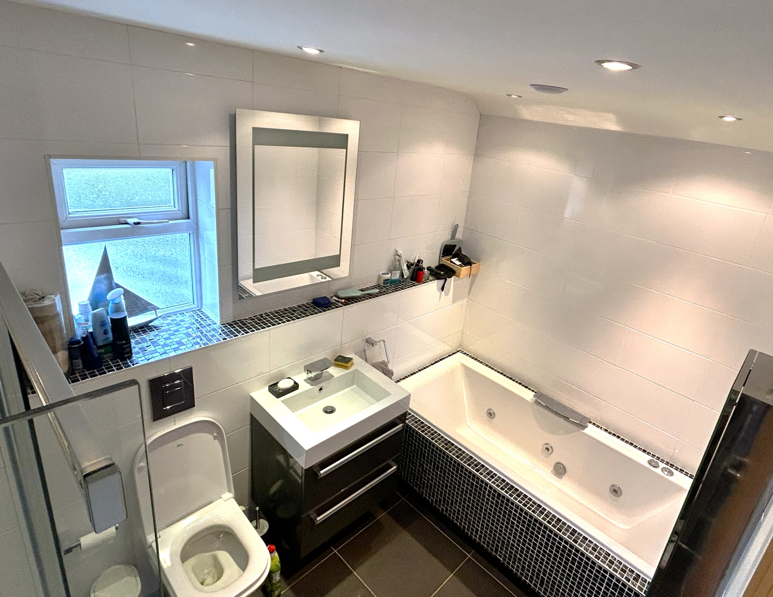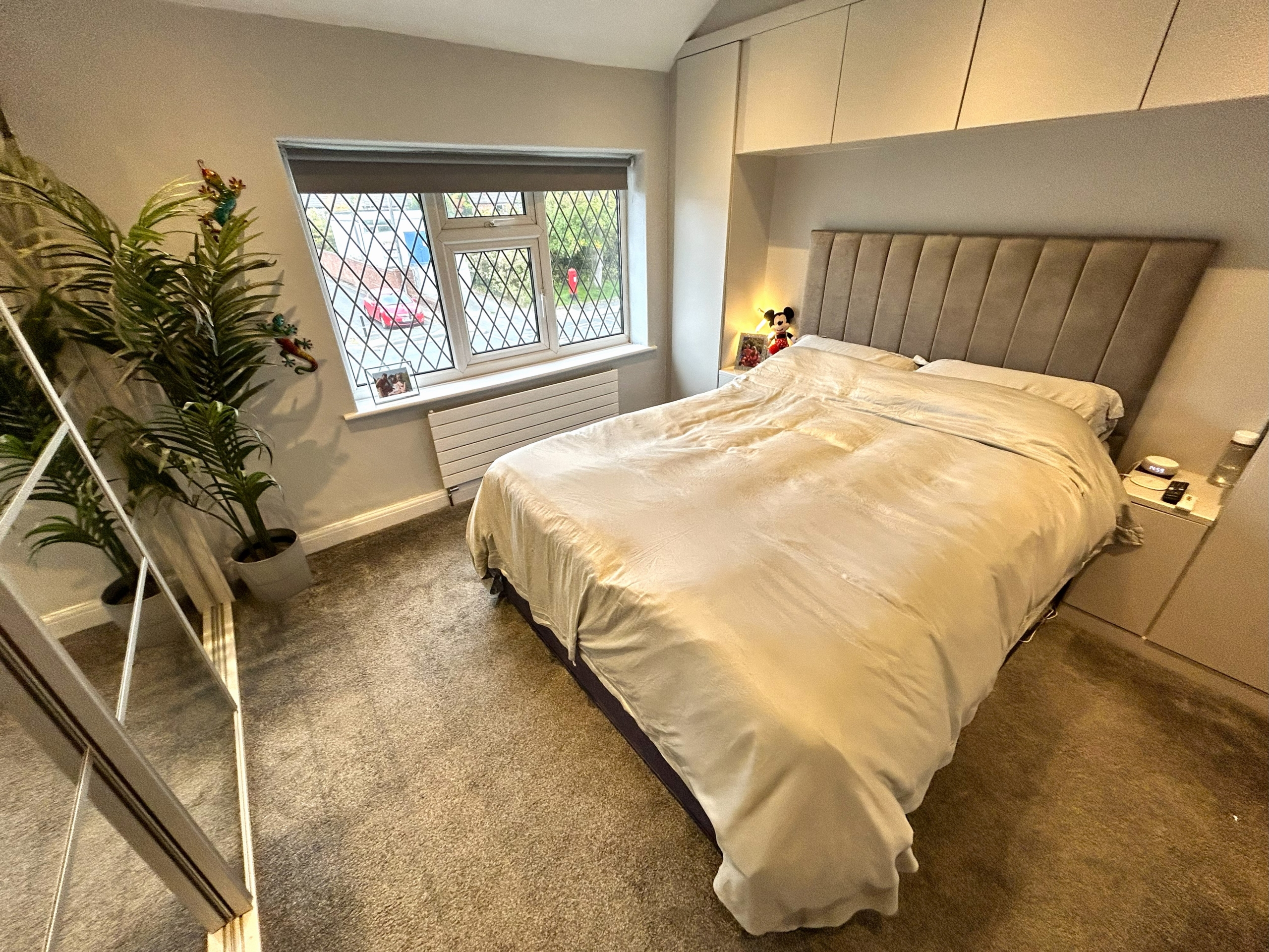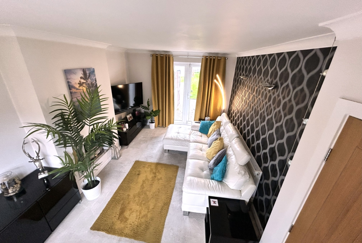 The kitchen has been designed to a high modern standard with plenty of countertop space and high-quality built-in appliances. The space flows nicely into the conservatory / dining area with remote control motorised blinds and on through double doors which lead you out to a decked area and the large rear garden.  There is also a side door for access to the bin store area, rear gate and driveway.