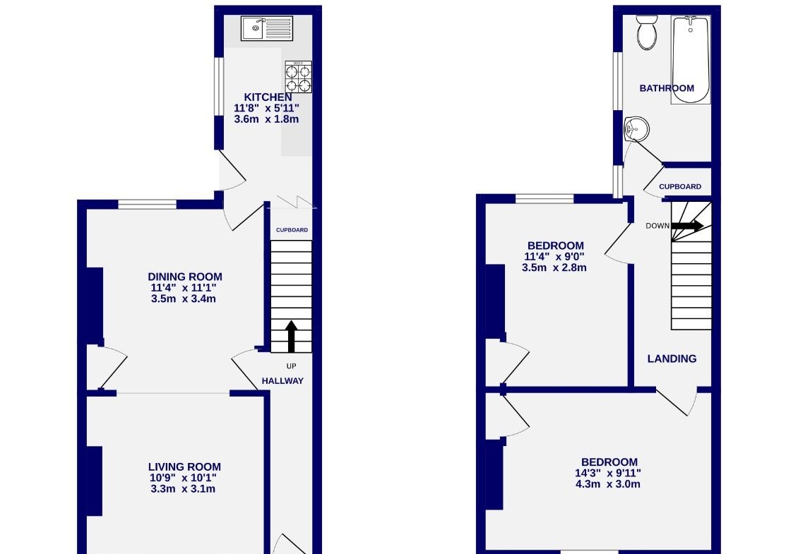 Inside, the property opens into an entrance hall leading to a bright and airy open-plan reception space, with windows to both the front and rear allowing natural light to fill the room throughout the day. To the rear, the kitchen is fitted with a range of wall and base units, providing ample storage and worktop space. Upstairs, a bright landing with built-in storage leads to two comfortable double bedrooms, both enjoying plenty of natural light. Completing the internal accommodation is the three-piece bathroom, on the first floor.